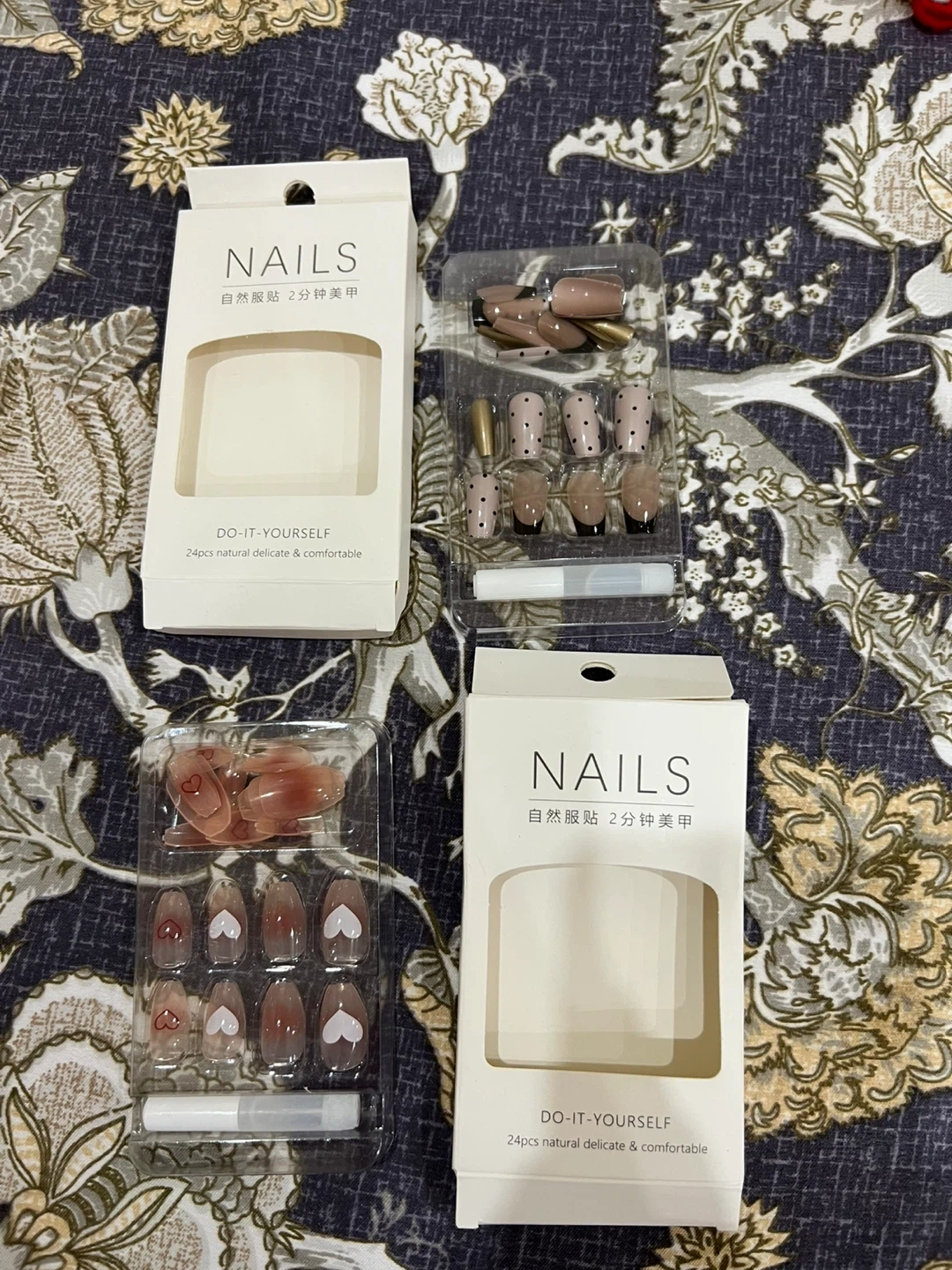 Two sets of 24 press-on nails included. One set features a nude base with black tips and polka dots, while the other has a clear base with heart designs. These are designed for easy DIY application. Includes adhesive glue.