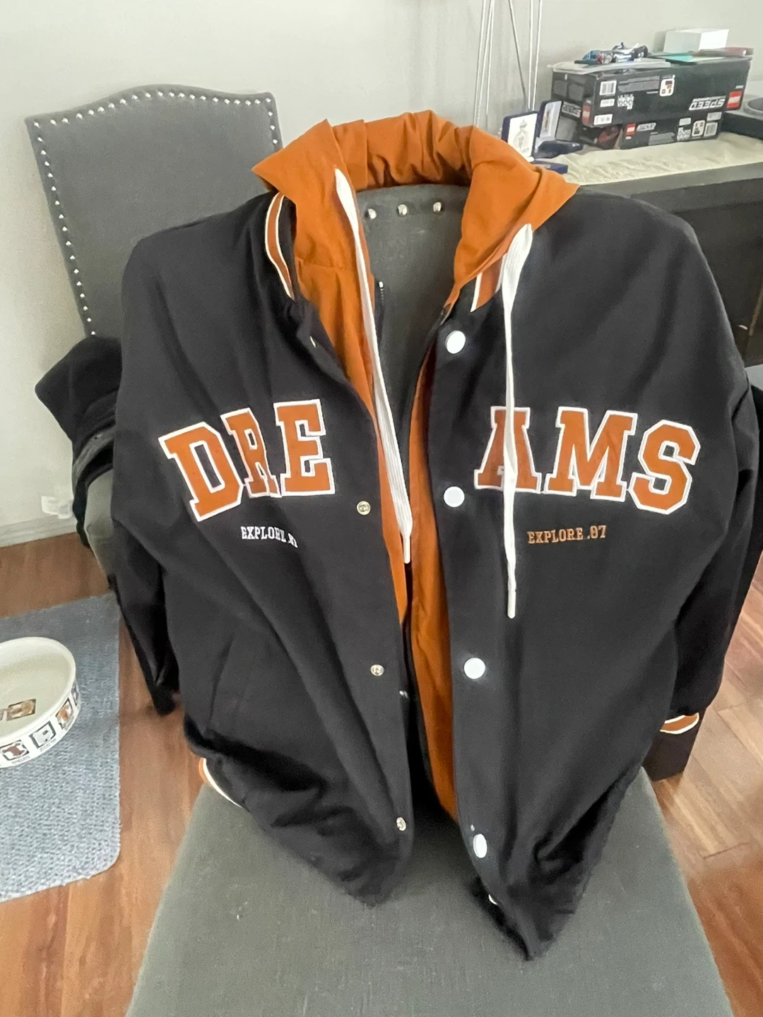 Black Letterman Jacket with Orange Hood - Size L