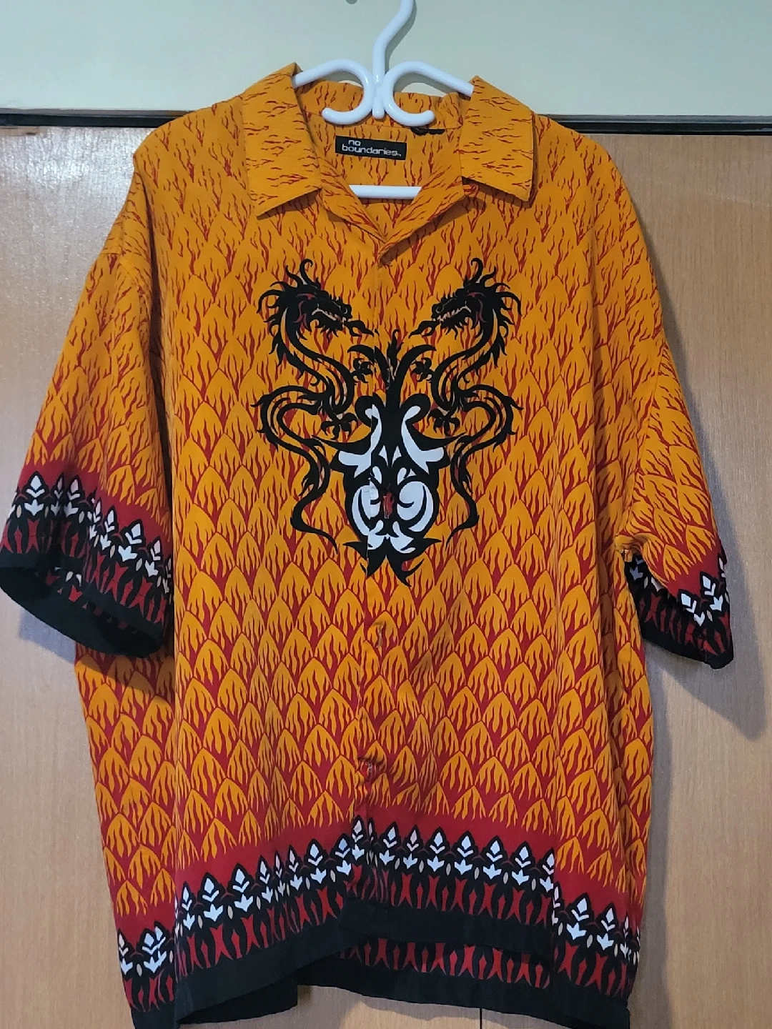 71Here's a cool No Boundaries button-up shirt with a unique graphic design! The shirt features a vibrant pattern with dragon details, perfect for making a statement. It's in great condition and ready for a new home! Oversized.