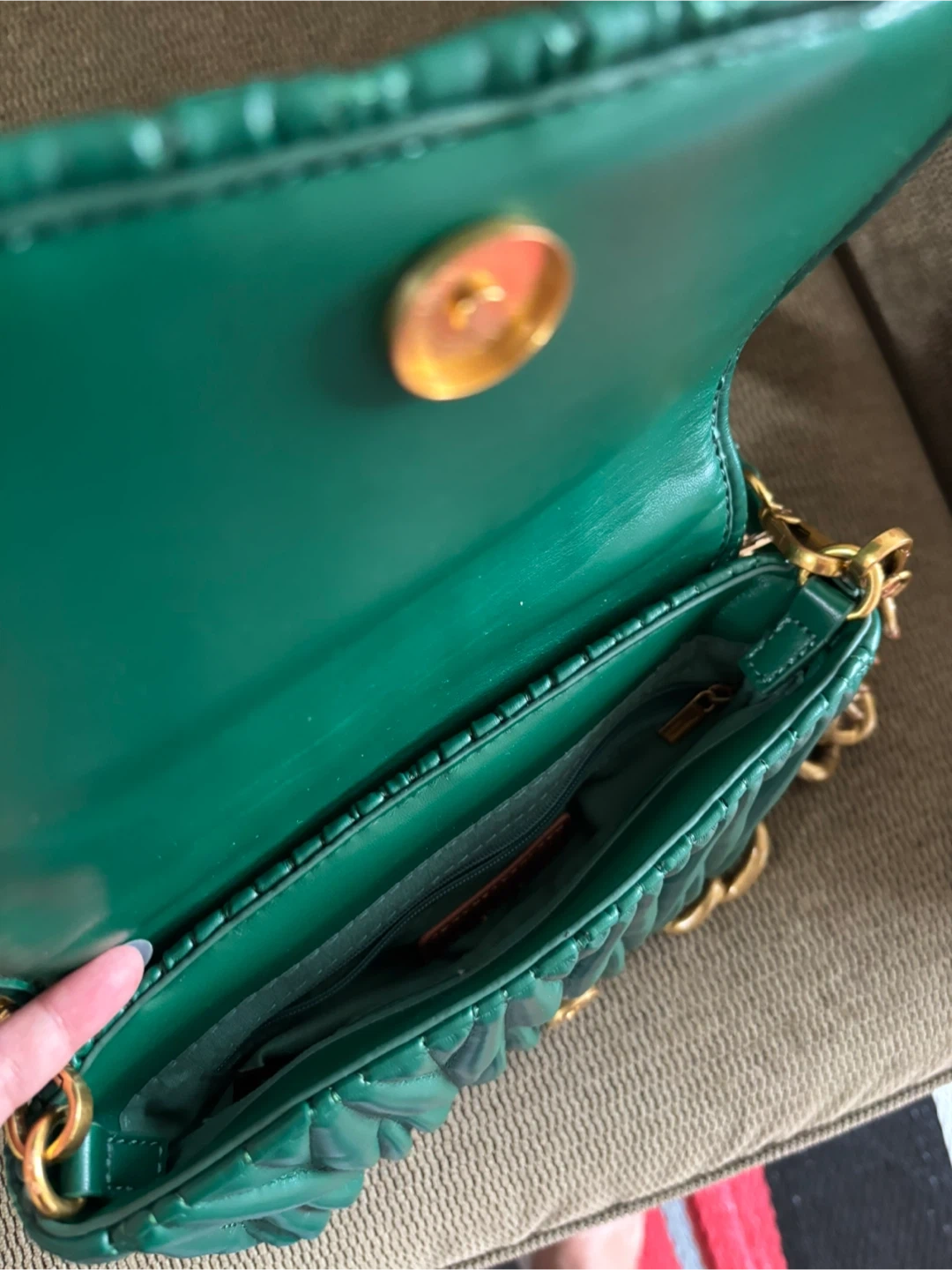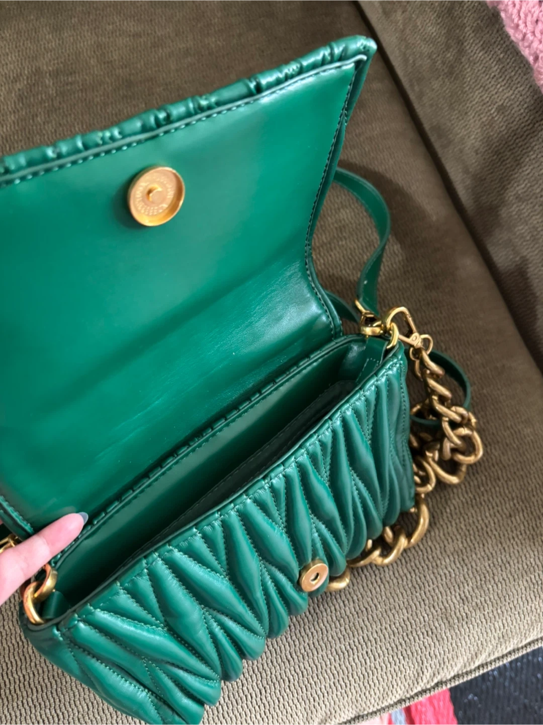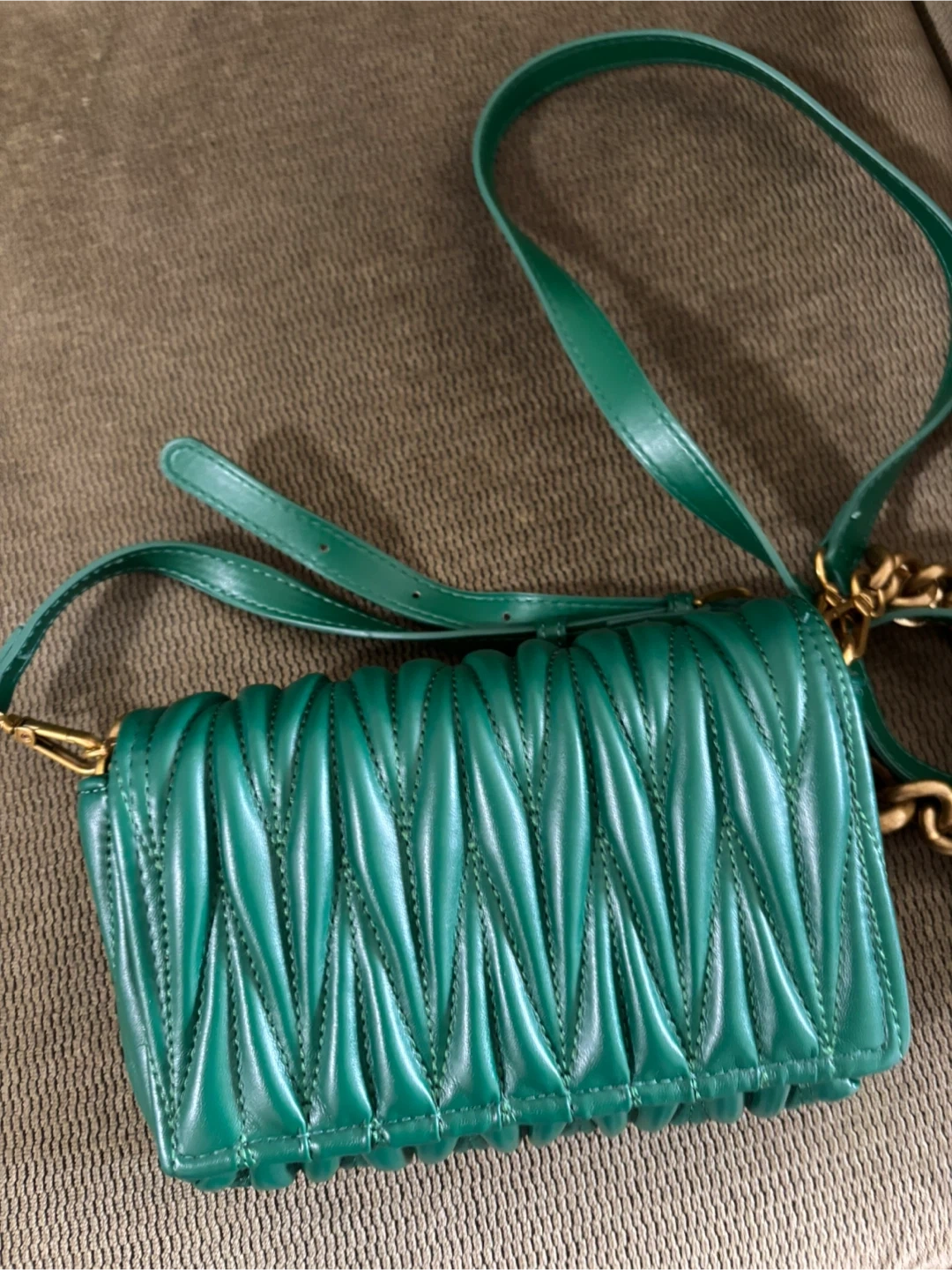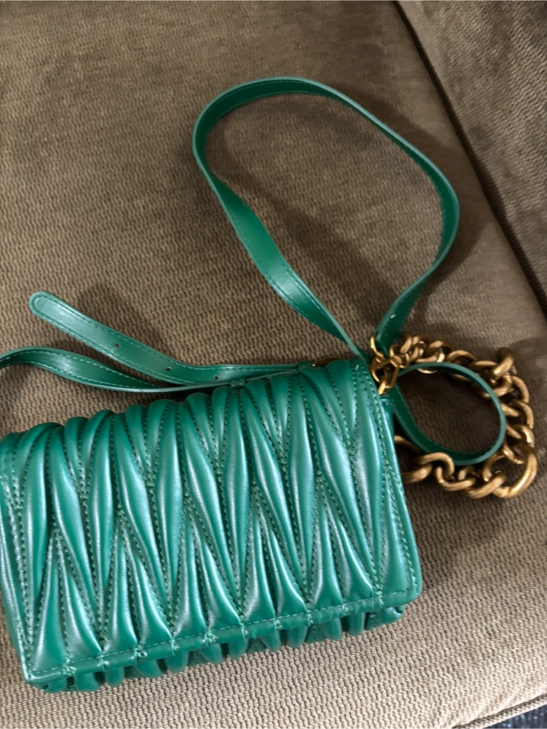39Selling a stylish shoulder bag in a beautiful green color. It features a unique quilted design and gold chain detailing. Perfect for adding a pop of color to any outfit!