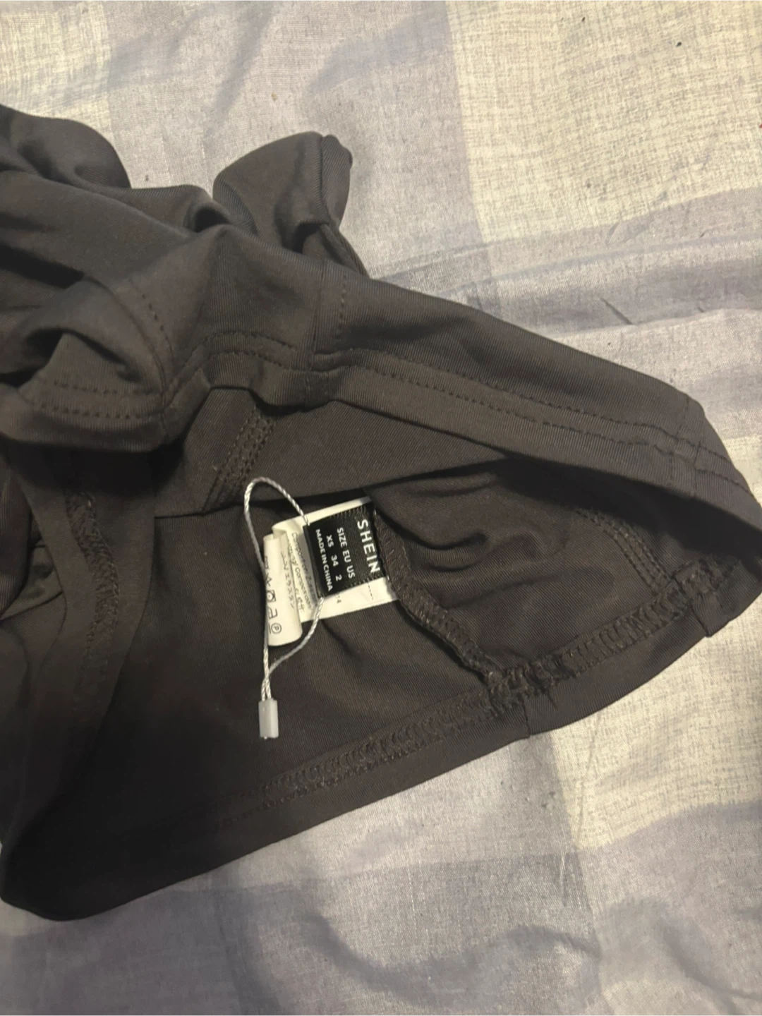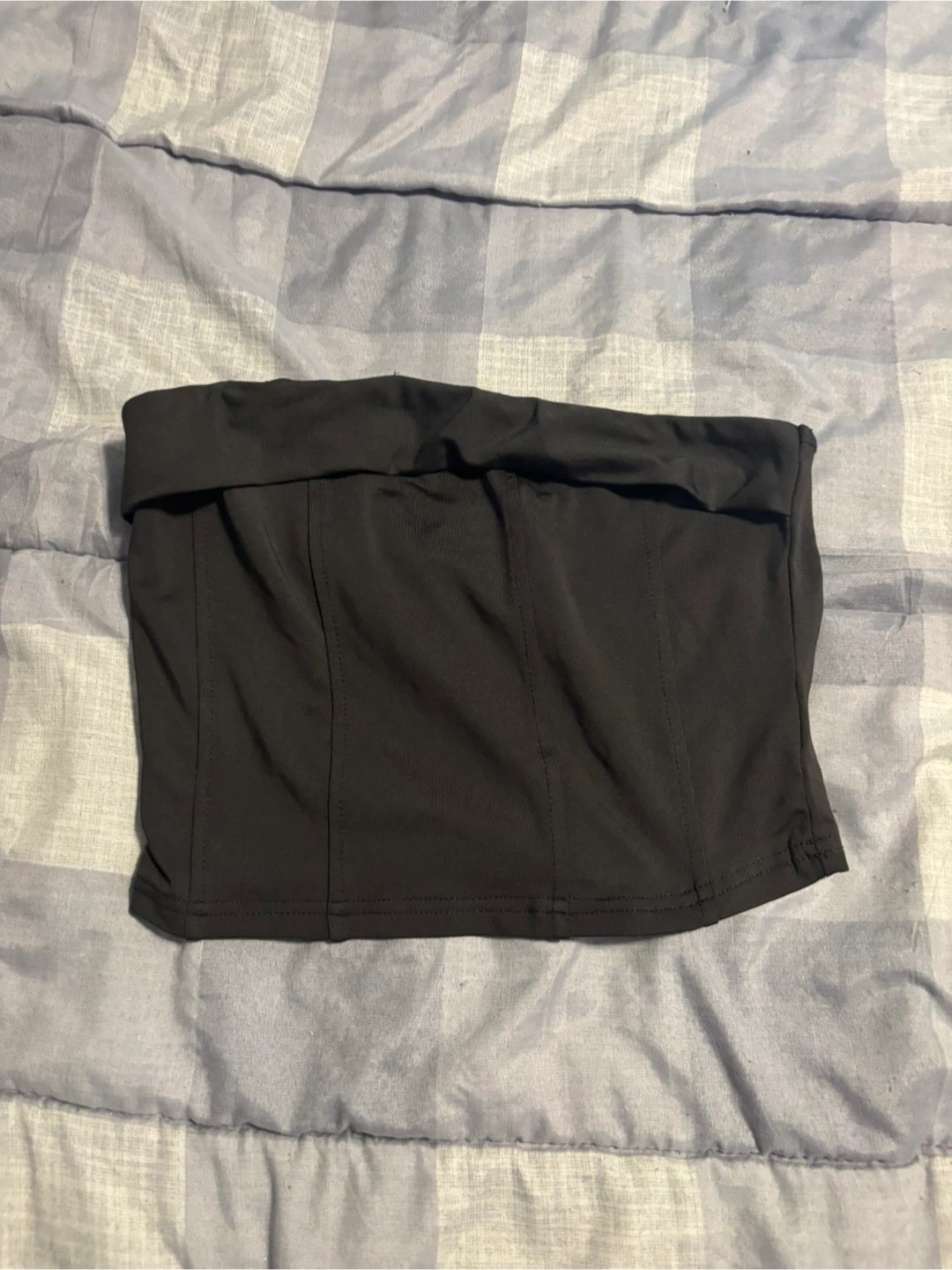 This is a black corset-style tube top from SHEIN. It's a size XS with EU size 34. Made from a stretchy material for a comfortable fit. This top is great for layering or wearing on its own during warmer weather!