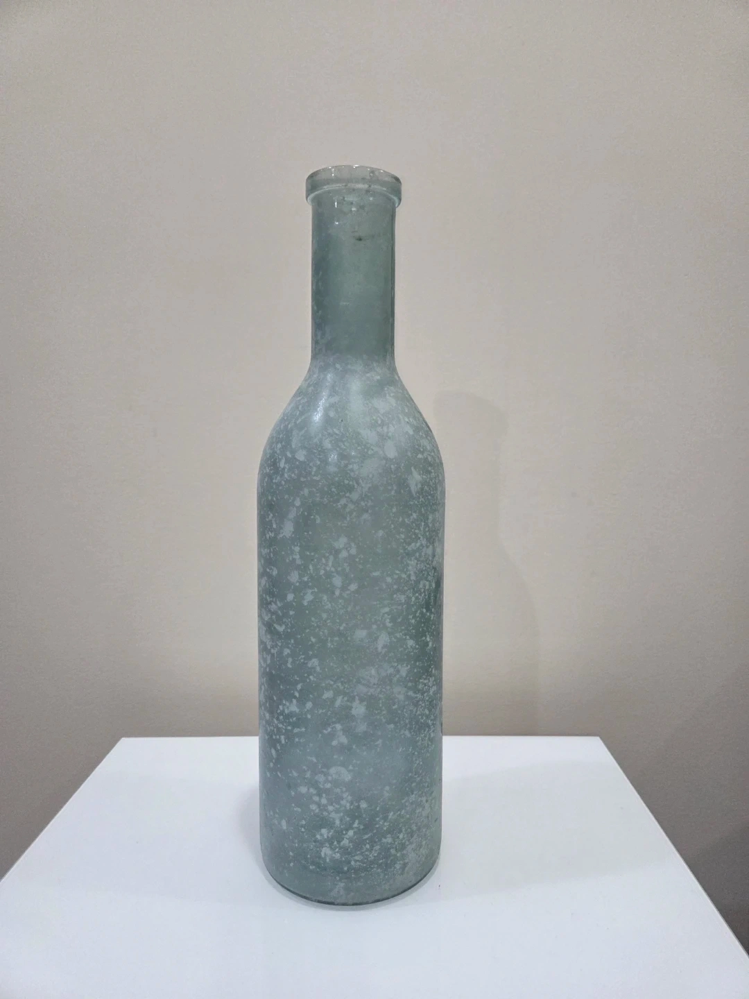 A frosted glass bottle with a speckled pattern. It's a light teal colour. This bottle could be used for home decor or as a vase. It's made of glass.