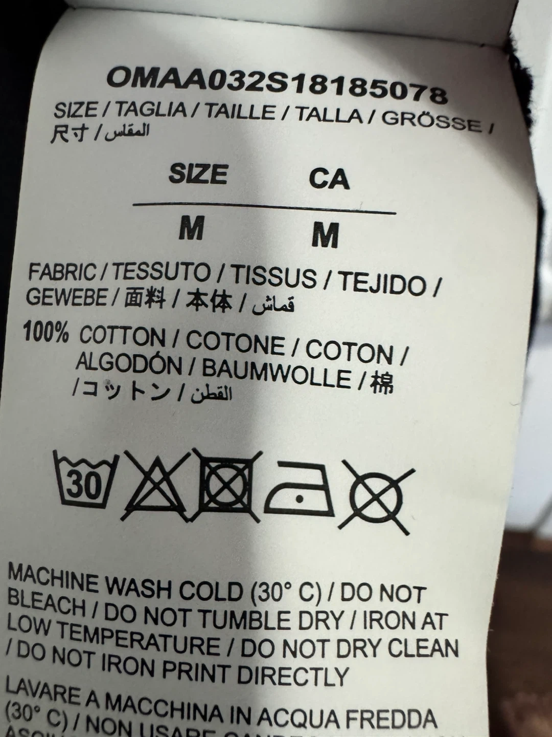This is an Off-White t-shirt featuring a "Main Label" graphic with flaming hands and diagonal stripes. It's made of cotton. This graphic tee is suitable for casual wear.