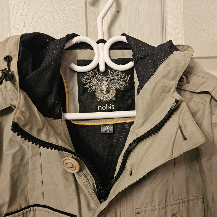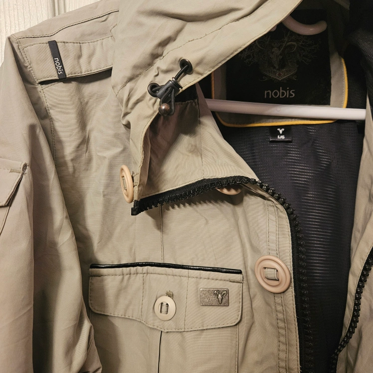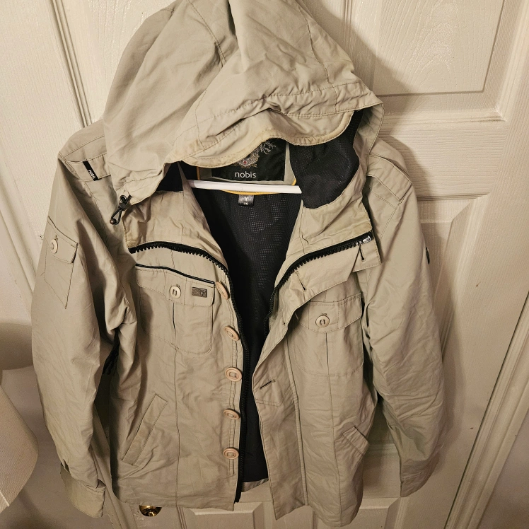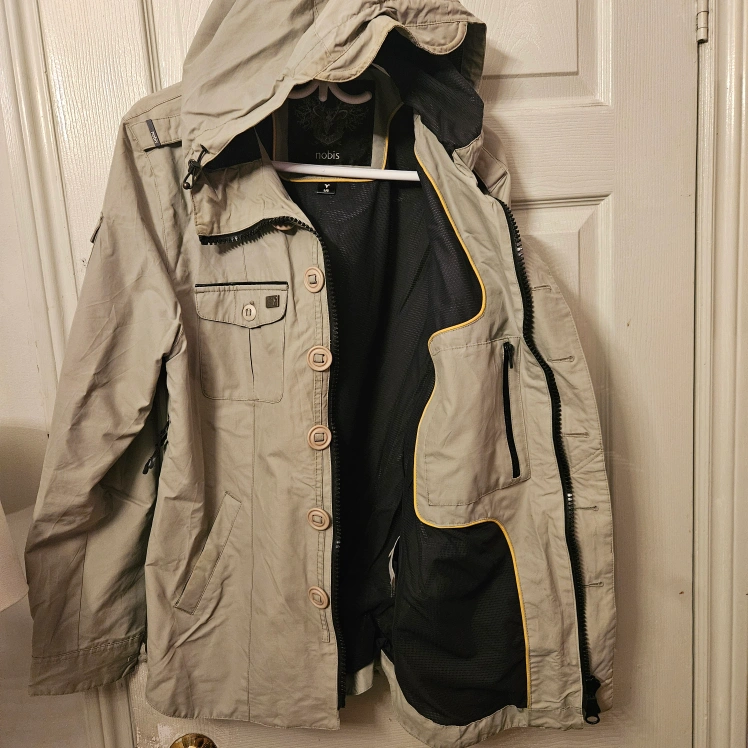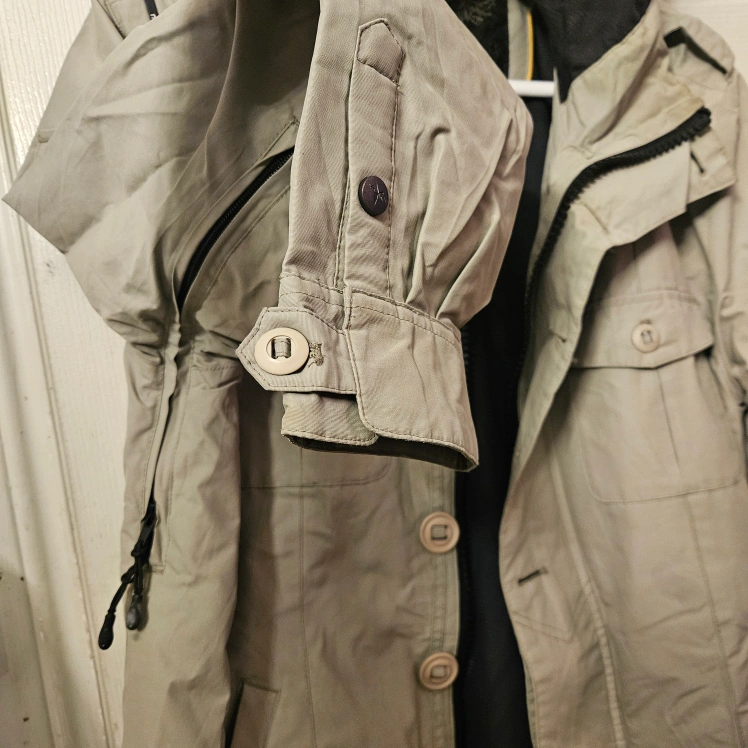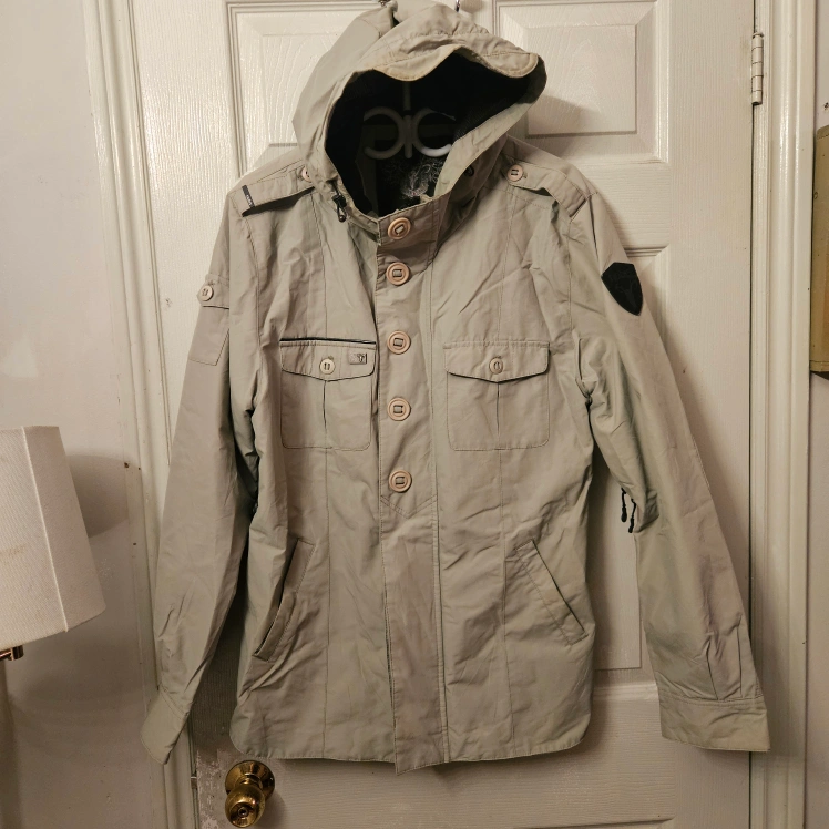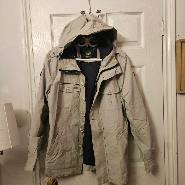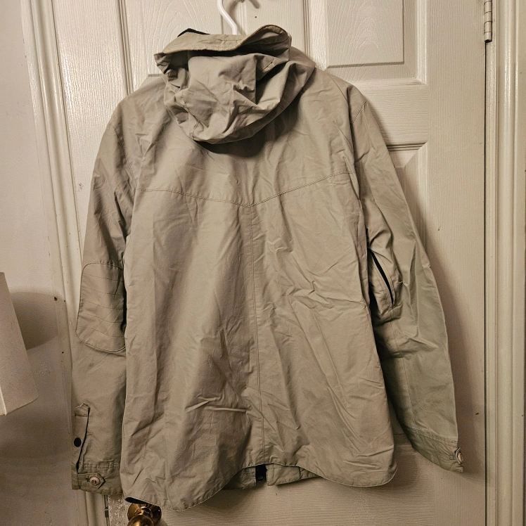 255Very lightly worn, like new. Men's light tan jacket with a hood. Features multiple pockets and a zipper and button closure. Size Large. • Premium Cotton/Nylon fabrication • Chest pockets • Interior zip pocket • Embrace membrane lamination • Seam seal construction • Windproof, waterproof and breathable • Designed in Canada pickup at ossington station.
