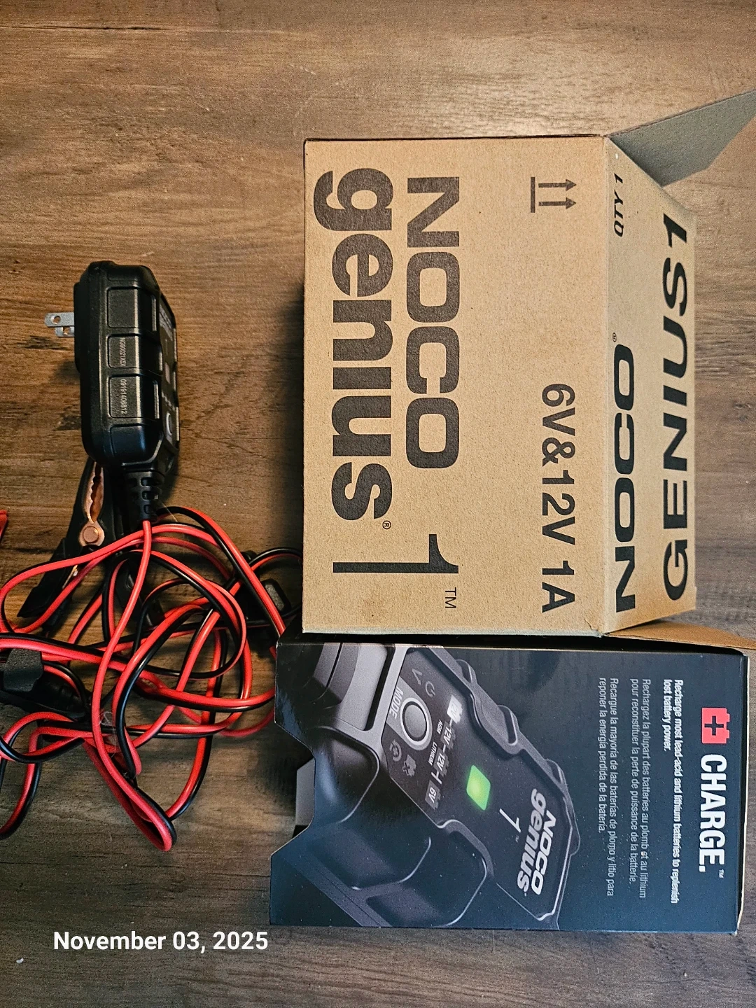 33Selling a NOCO Genius 1 Battery Charger and Maintainer in excellent condition! It's designed for both 6V and 12V batteries. It comes with the original box and all included components, ensuring you have everything you need to keep your batteries in top shape