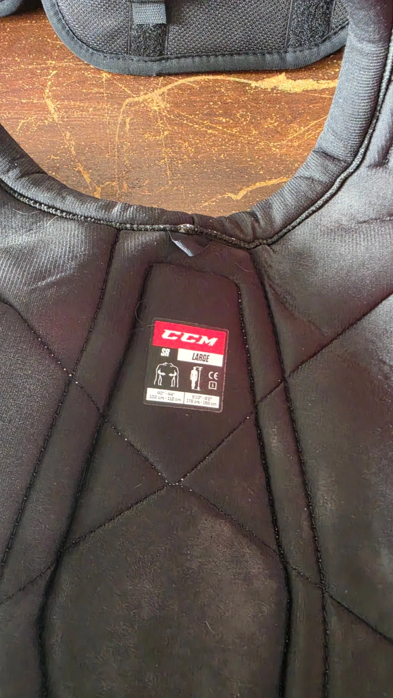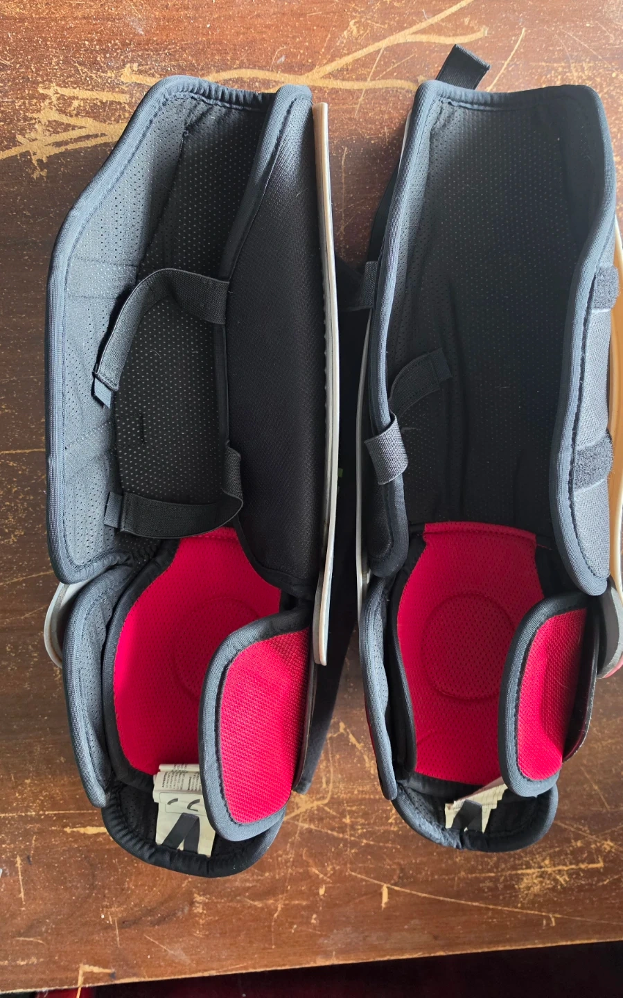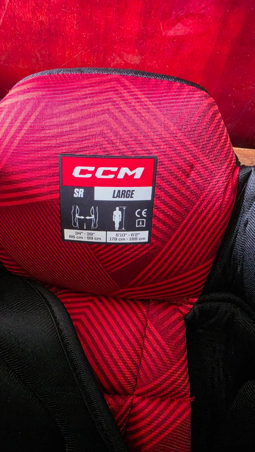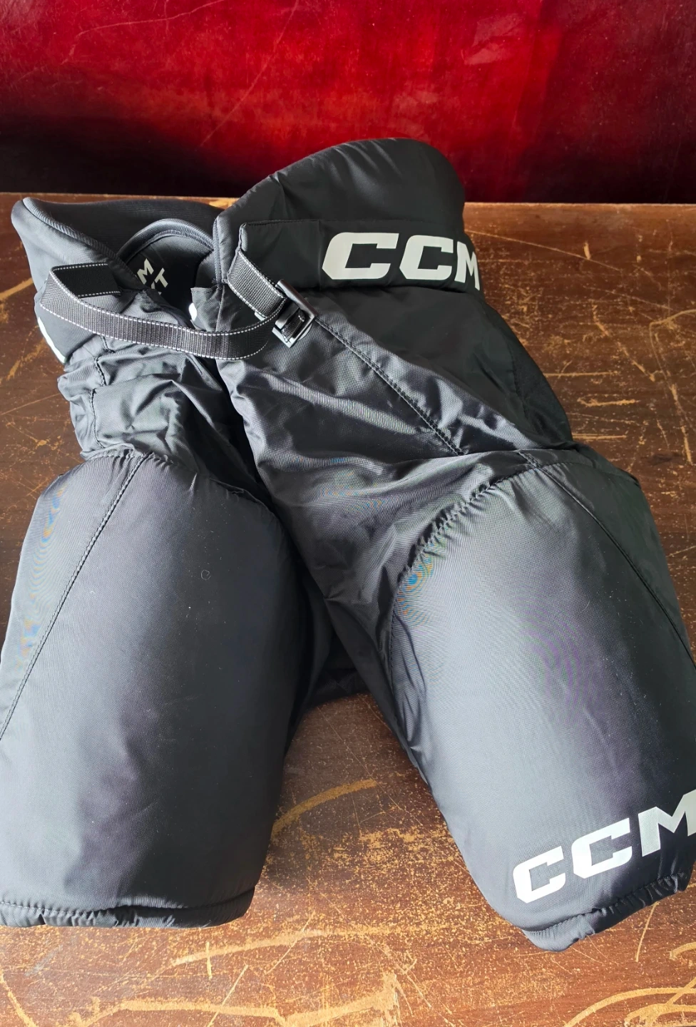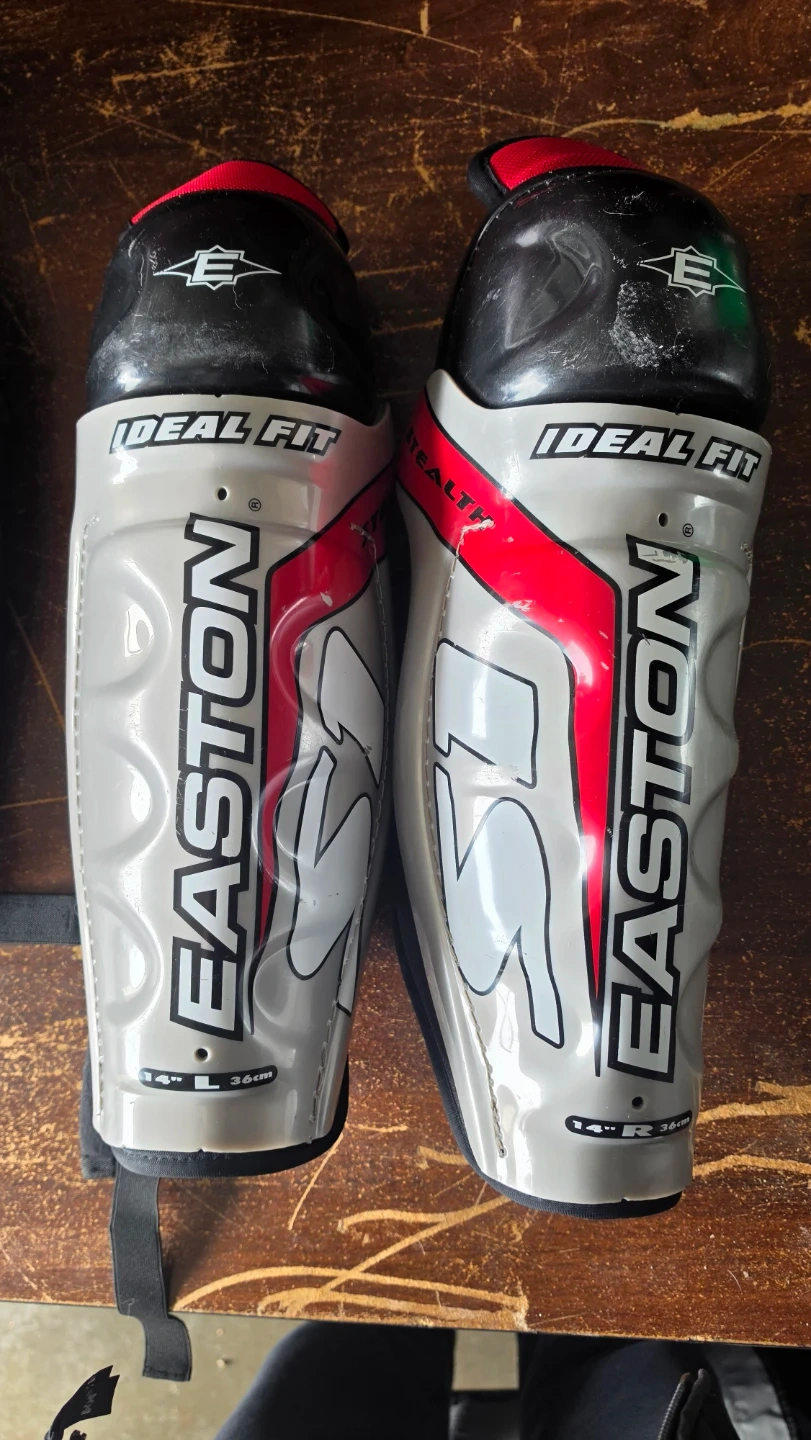 This lot includes CCM hockey pants and shoulder pads, along with Easton Shin Guards. The Easton shin guards are labelled 14" L and 14" R (36cm). The CCM gear is labelled FT475 and JetSpeed.