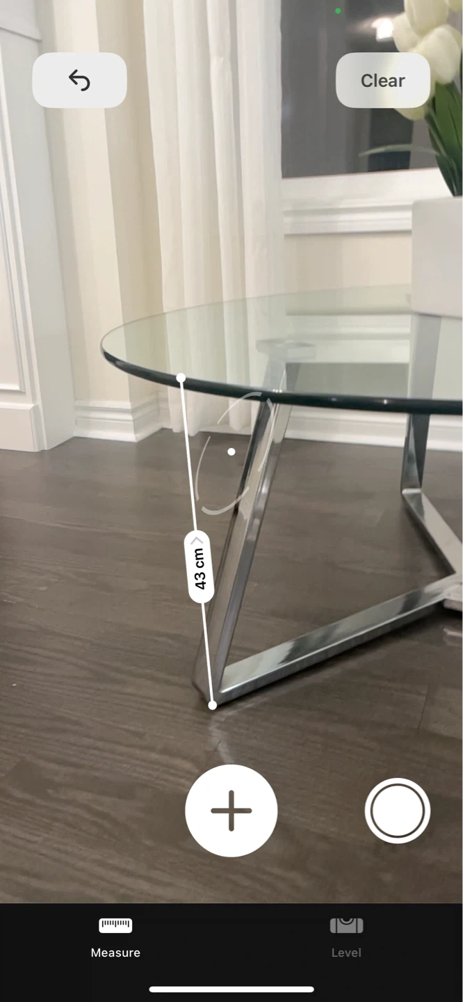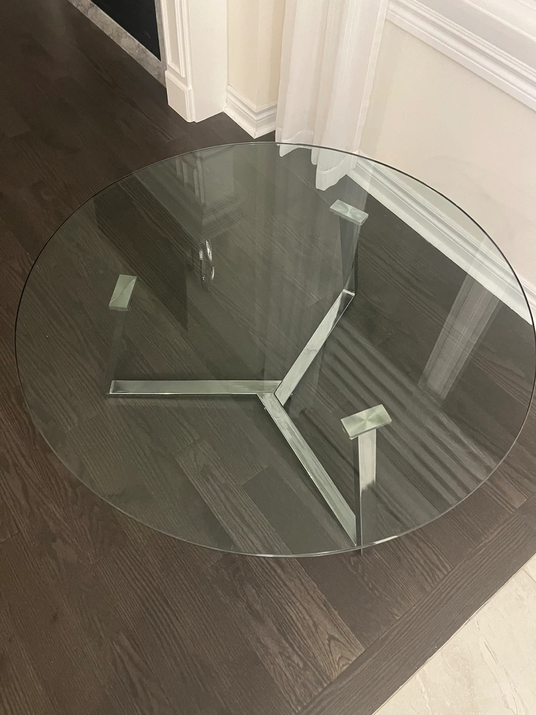 Round glass top coffee table with a modern chrome base. Height measures 43 cm. It's a stylish addition to any living room!