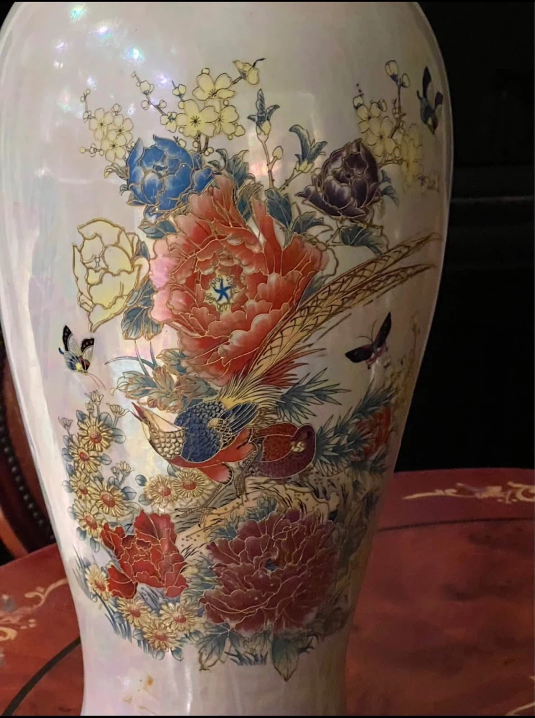 This is a beautiful pearlescent vase featuring a detailed bird and floral design. It has a fluted neck and a wide base, perfect for display. Adds an elegant touch to any room!