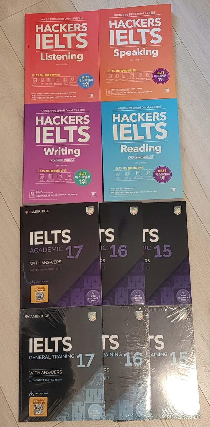 This bundle includes Hackers IELTS Academic modules for Listening, Speaking, Writing, and Reading. It also contains Cambridge IELTS Academic practice tests volumes 15, 16, and 17, as well as General Training volumes 15, 16, and 17. All books come with answers and audio resources.