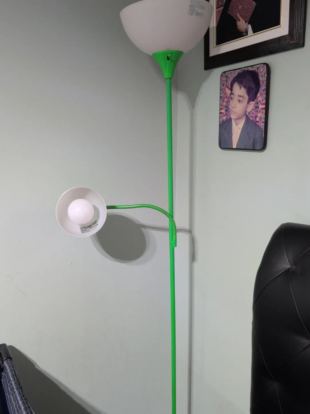 This is a bright green floor lamp with a flexible gooseneck reading light. It's perfect for providing targeted light where you need it most! The lamp has a white, frosted main shade and a smaller, adjustable white shade for the reading light.