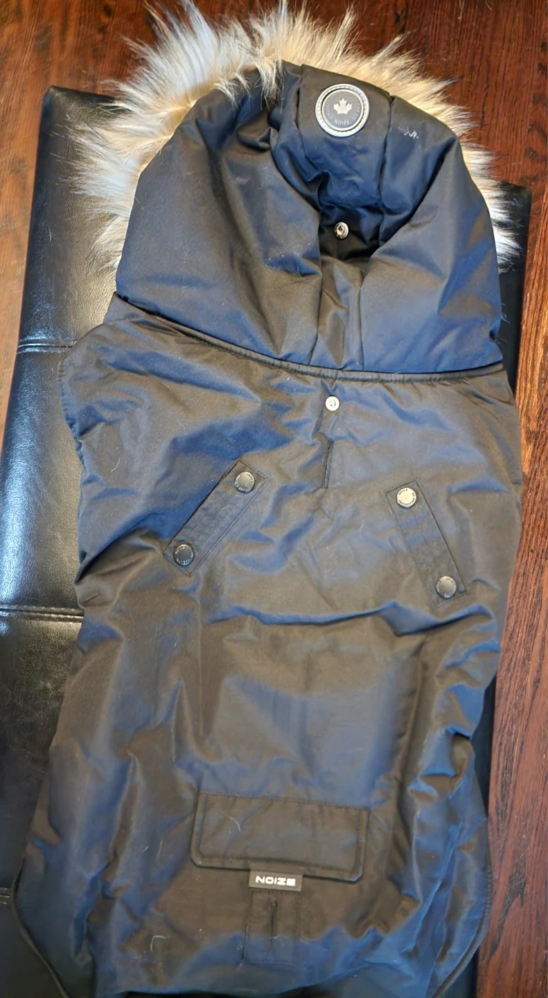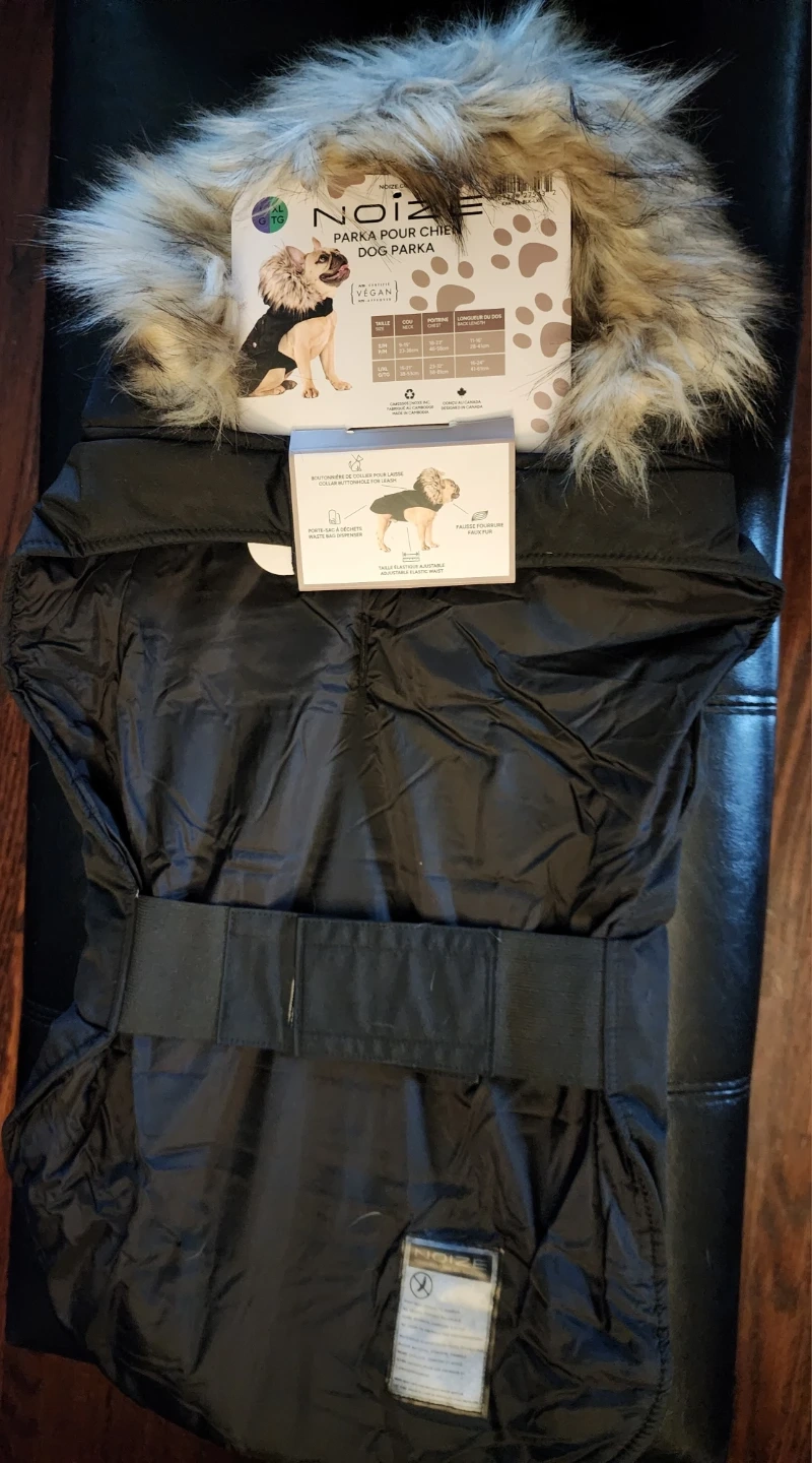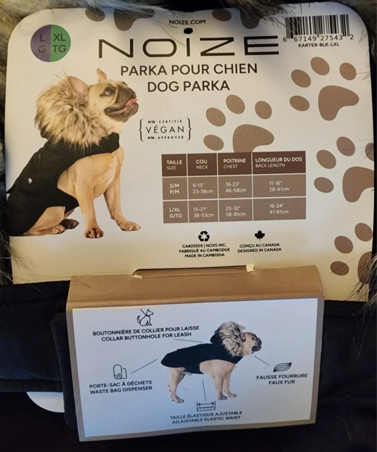 79Brand New Beautiful and Stylish Noize Black Large/Extra Large Parka Dog Winter Coat. $40 each or $60 for both Bought Last Winter but too Big for Both my Dogs and Missed Window to Return Items. Selling a Noize Karter dog parka in black! It's a size L/XL and is water-resistant and vegan-approved. This stylish parka will keep your furry friend warm and dry. The parka has an adjustable elastic waist and a faux fur trim. It also features a collar buttonhole for a leash and a waste bag dispenser. No Low Ballers, No Delivery, Can Meet if within Reasonable Distance. Keep your furry friend warm with this Noize Karter Dog Parka! It's black and size L/XL (TG). This parka is water-resistant and vegan-approved. It also includes a collar buttonhole for a leash and an adjustable elastic waist. The size chart indicates it fits dogs with a chest size of 23-32" (58-81cm) and a back length of 16-24" (41-61cm)
