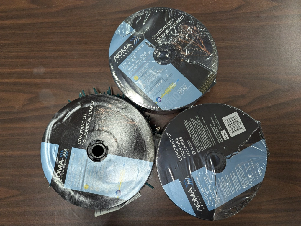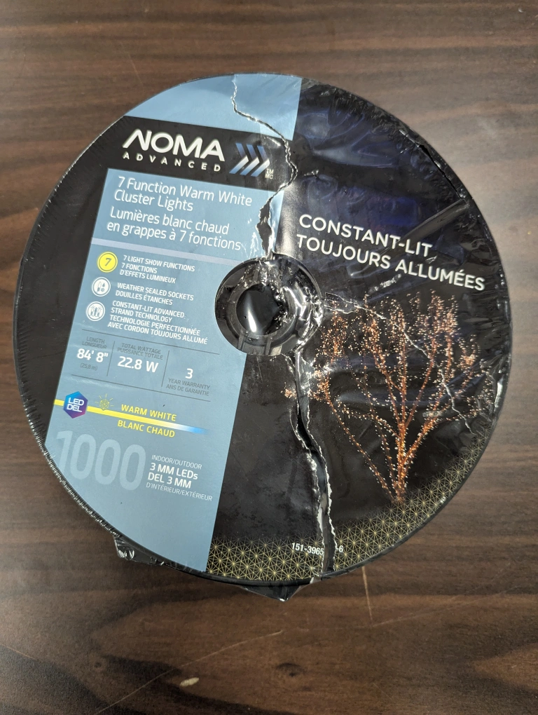I have 3 of these, going for $10 each. one is opened and the other 2 are still in it's packaging. Selling a set of NOMA Advanced 7 Function Warm White Cluster Lights. They're constant-lit and perfect for indoor or outdoor use. These lights are 86' 8" long and use 22.8W of power. They feature 1000 3mm LEDs in a warm white colour.