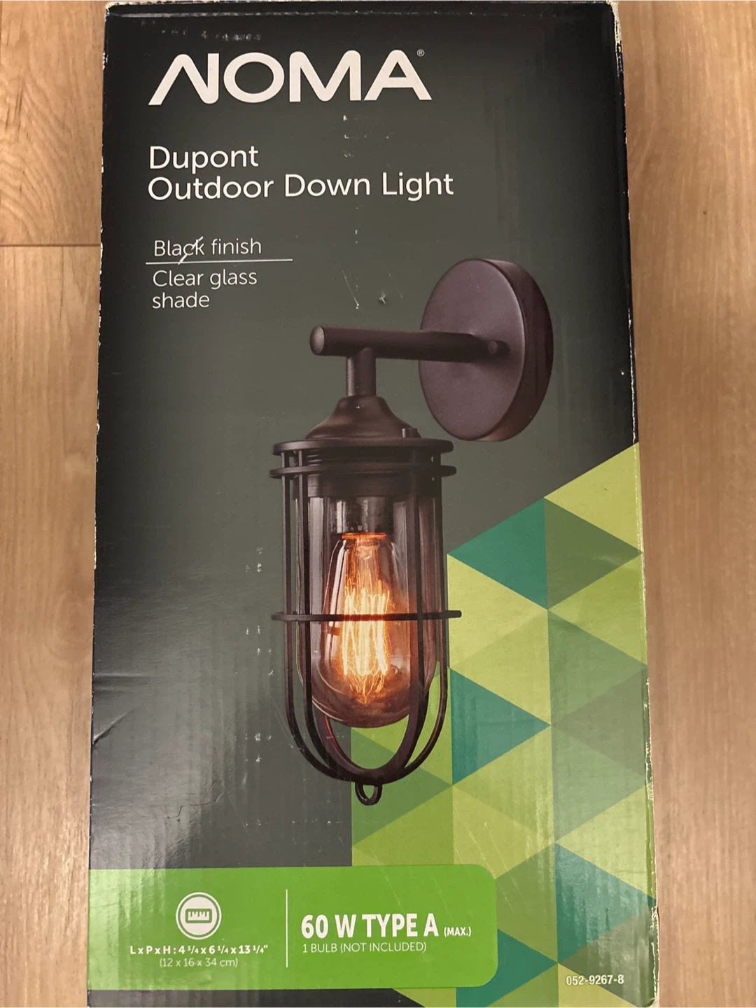 60Selling a NOMA Dupont outdoor down light with a sleek black finish and clear glass shade. The dimensions are 4 3/4 x 6 1/4 x 13 1/4 inches (12 x 16 x 34 cm). It supports a 60W Type A bulb (bulb not included).