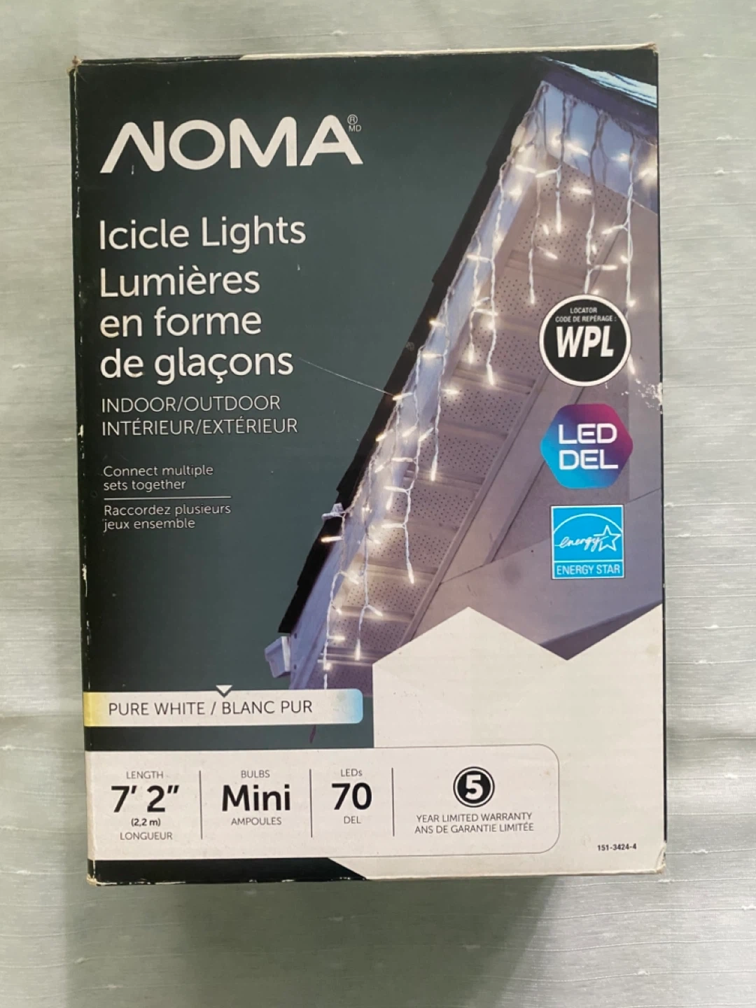 35Selling a set of NOMA icicle lights, perfect for indoor or outdoor use! They're pure white and measure 7' 2" in length. The set includes 70 LED bulbs and comes with a spare fuse and two spare bulbs. The box is included! Only used twice. Pick up in Clarkson Mississauga