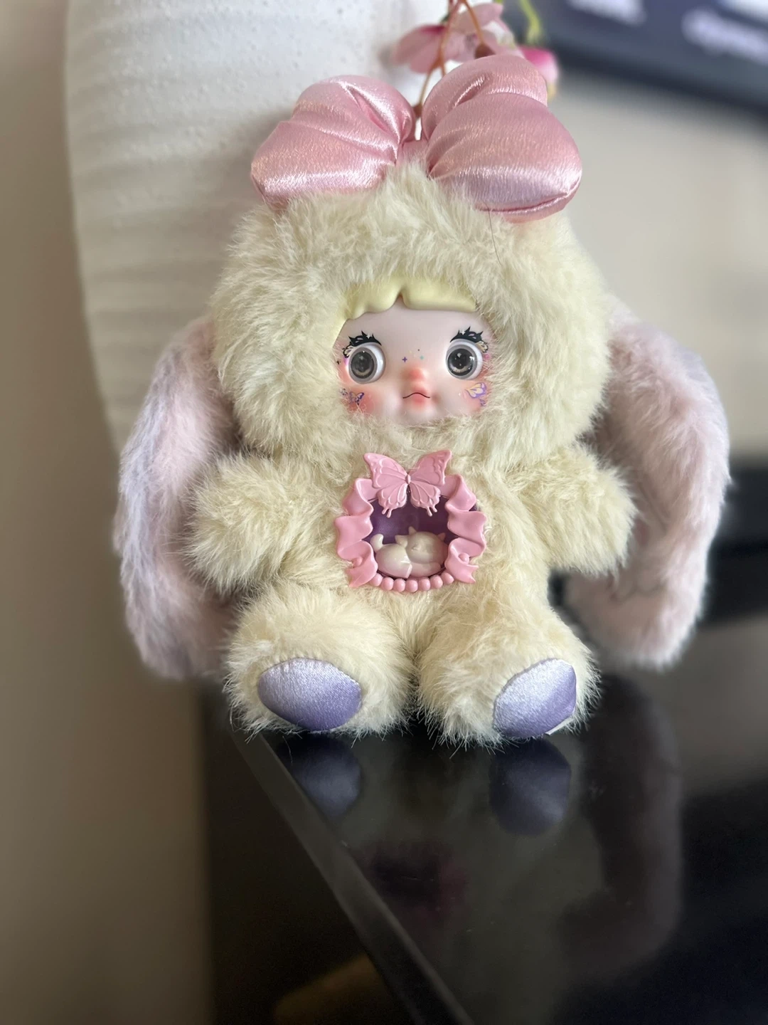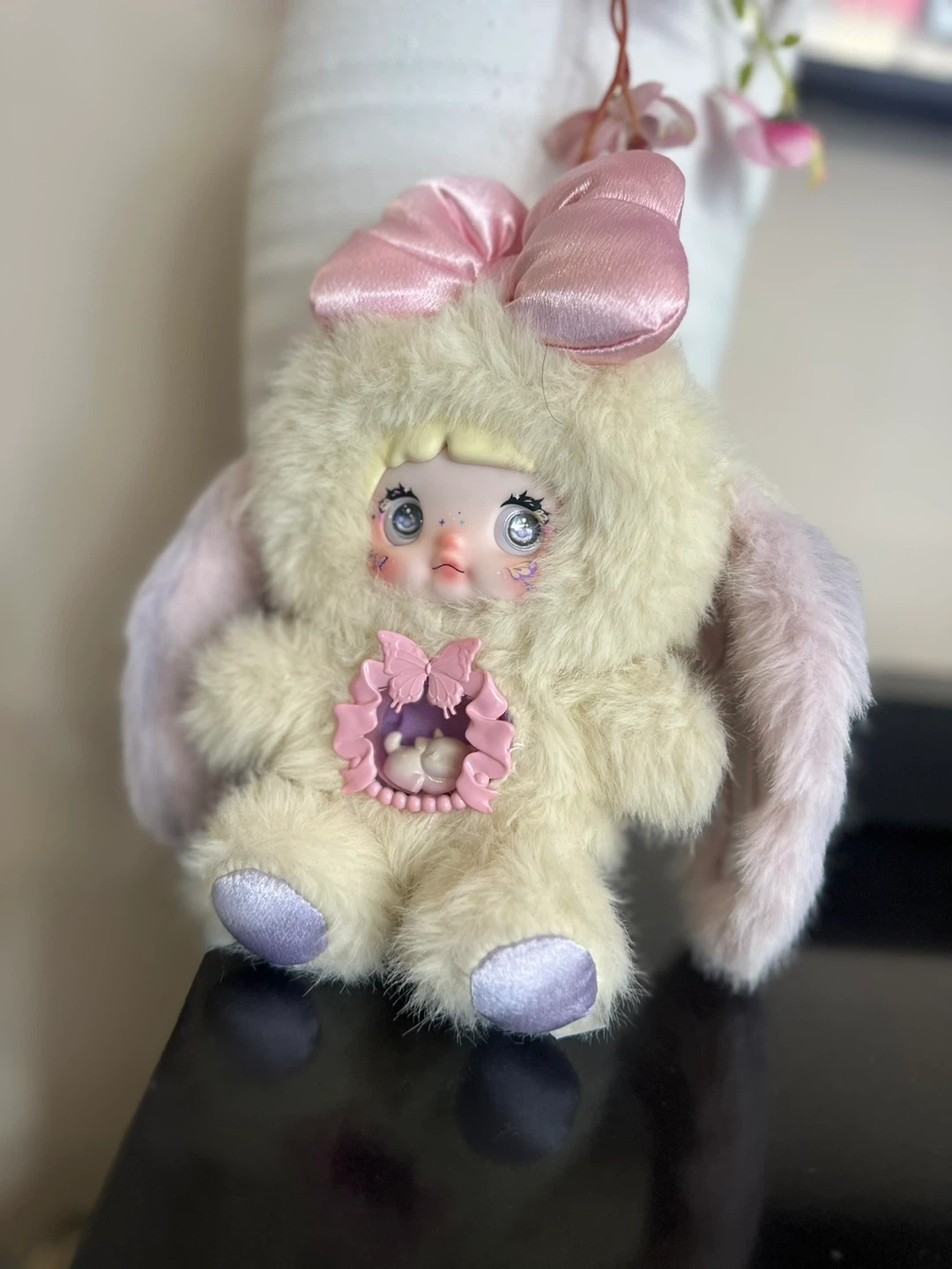 Selling an adorable bunny doll! It has a fluffy cream-colored body with pink accents, including a cute bow on its head and little lavender feet. It's in great condition and would make a lovely addition to any collection