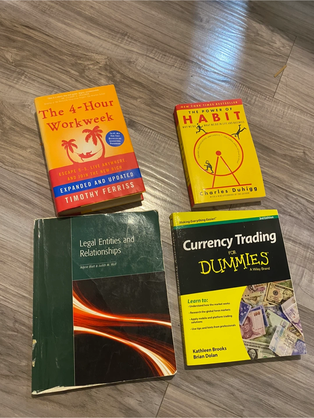 4 non fictions (self-help) book $10 each, or 2 for $15 , or all for $25 - The Power of Habit by Charles Duhigg - Legal Entities and Relationships by Arlene Blatt & Judith M. Wolf - The 4-Hour Workweek by Timothy Ferriss - Currency Trading for Dummies by Kathleen Brooks & Brian Dolan Pick near Victoria park and saint Claire Or meet up at Victoria park station