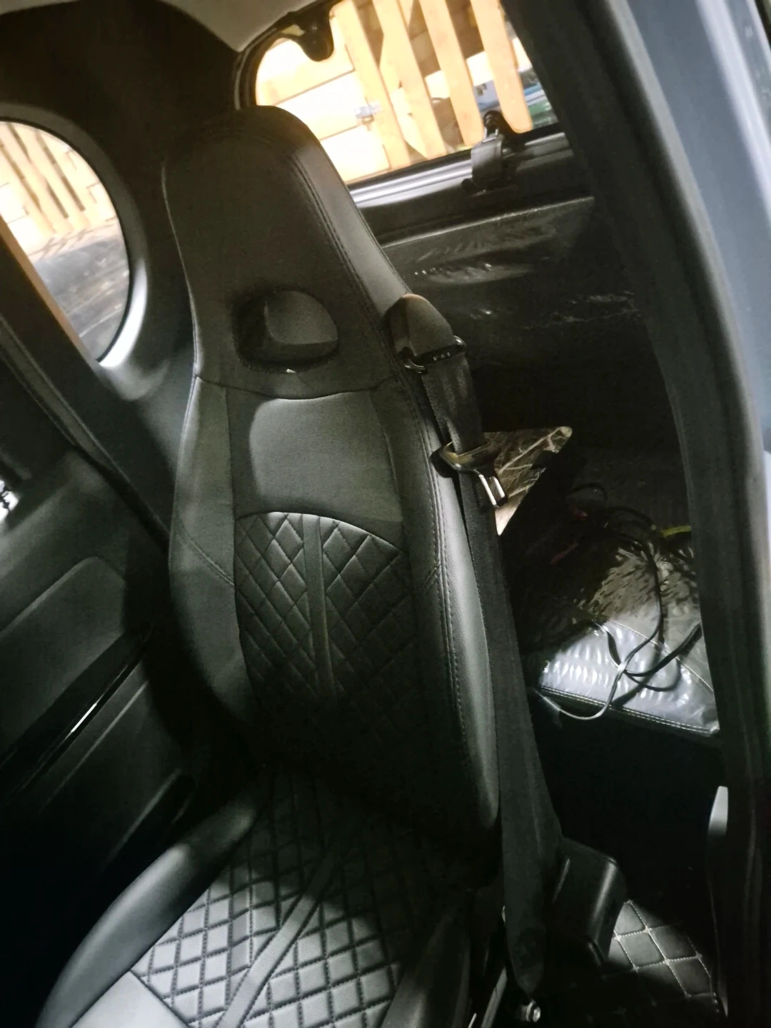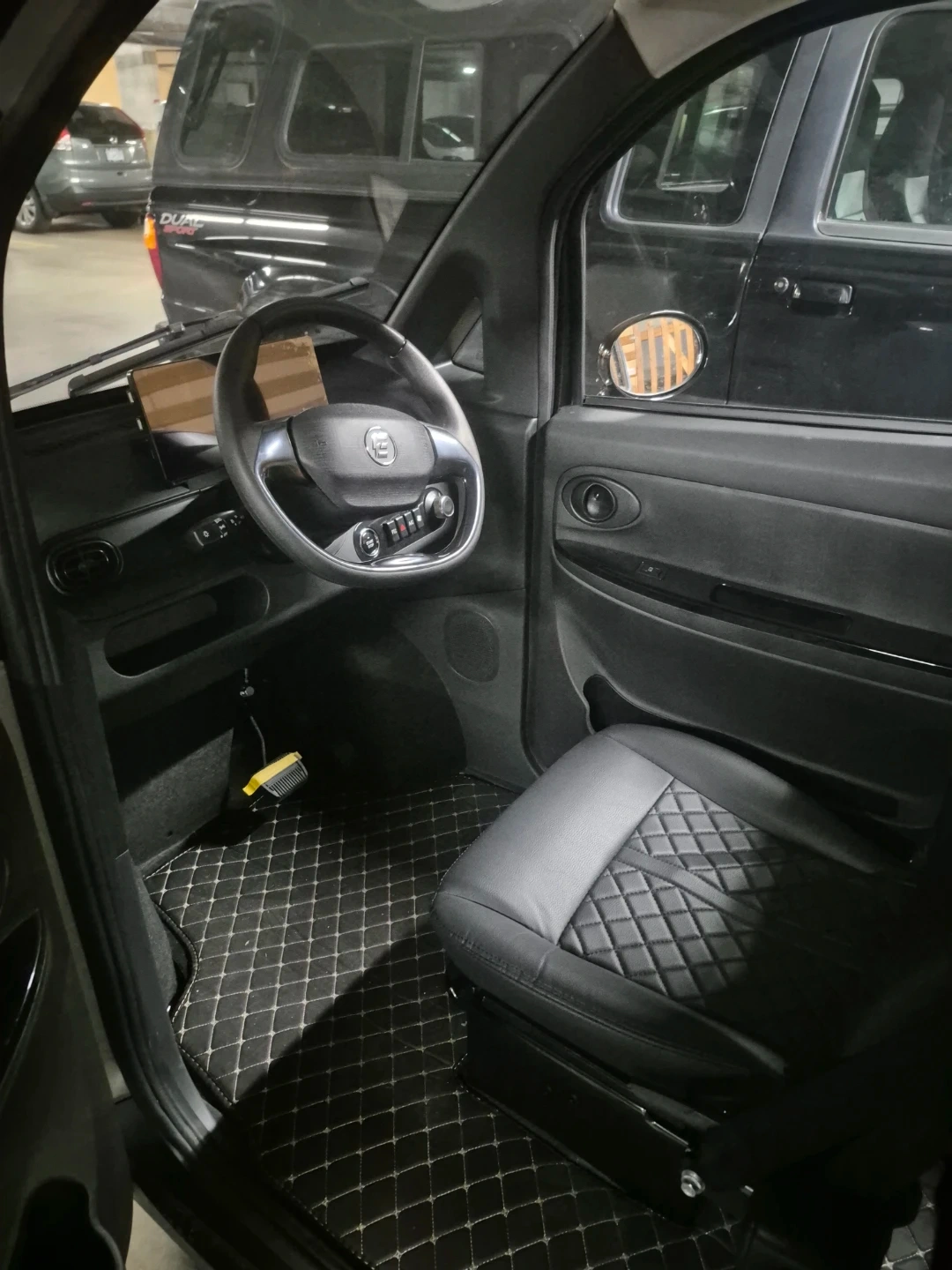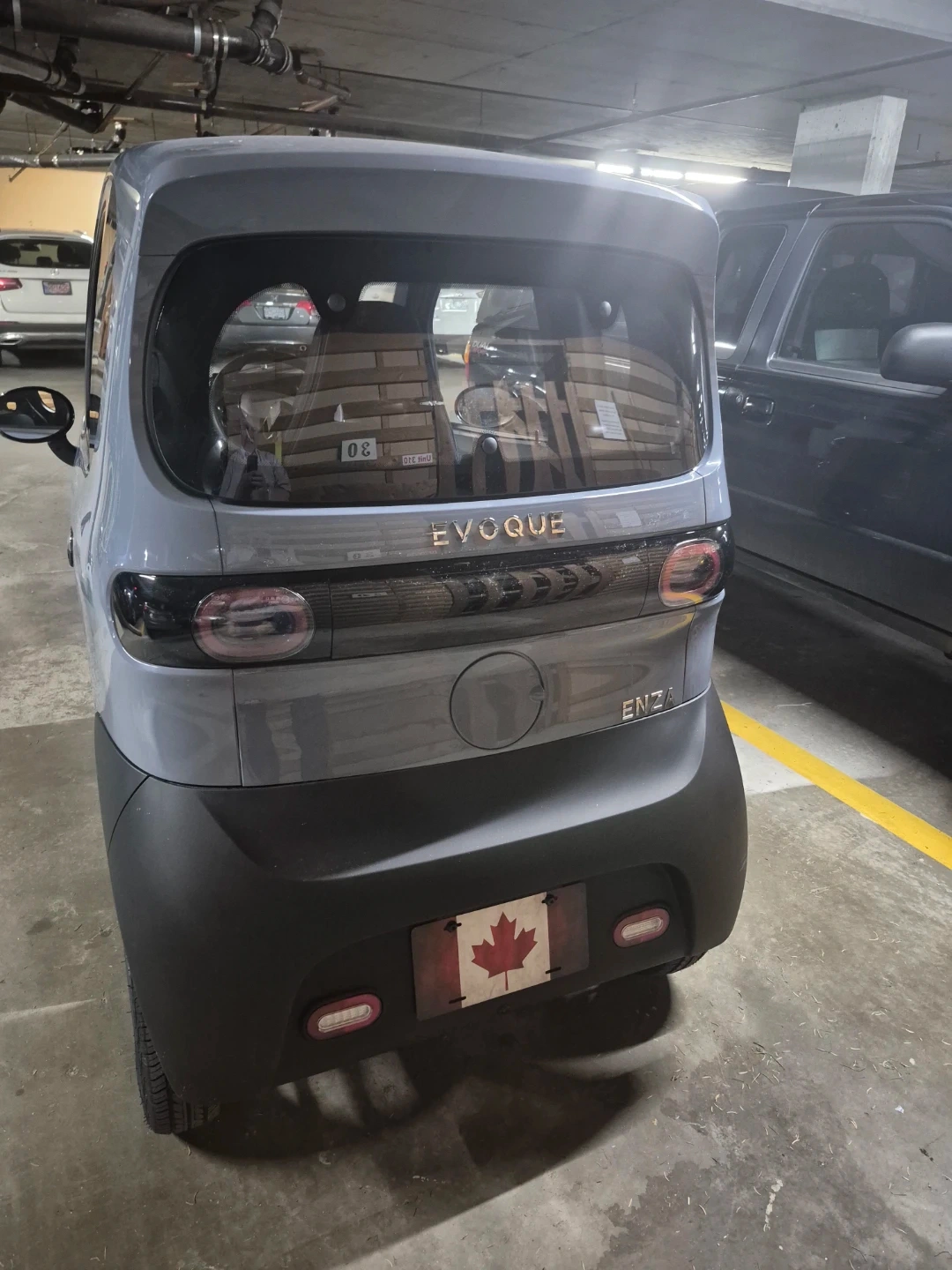 Grey EVOUQE ENZA electric car. It's a compact vehicle with a sleek design. Features quilted interior seating and custom floor mats. Great for city driving!