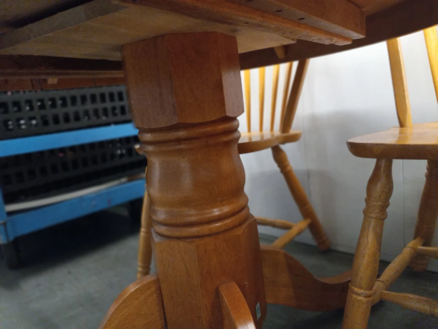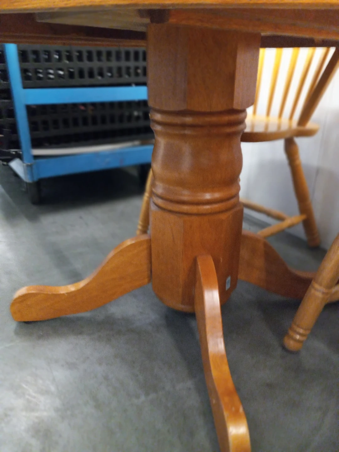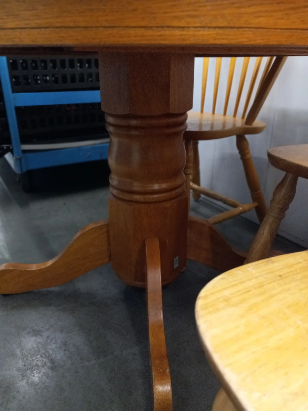 A classic wooden dining set perfect for smaller spaces. It includes one round table and four chairs with spindle backs. The wood has a warm, natural finish. This set's simple design makes it versatile for various home decors.