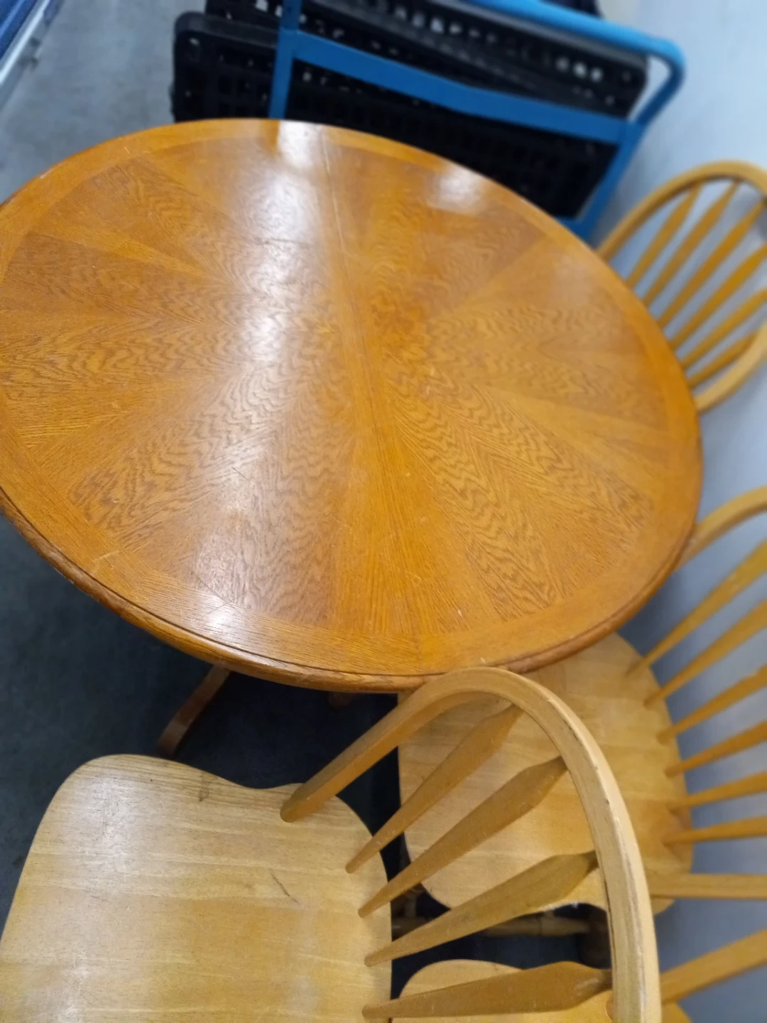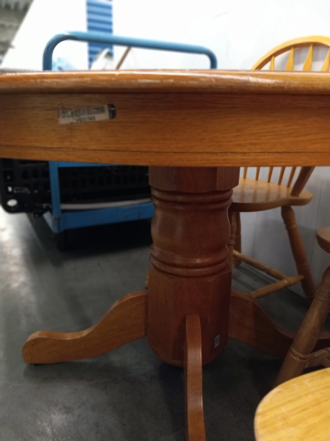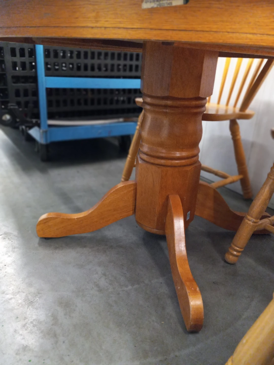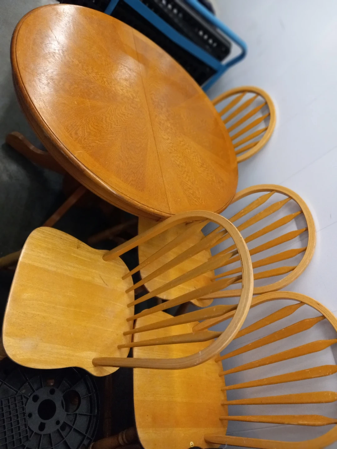 A classic wooden dining set perfect for smaller spaces. It includes one round table and four chairs with spindle backs. The wood has a warm, natural finish. This set's simple design makes it versatile for various home decors.