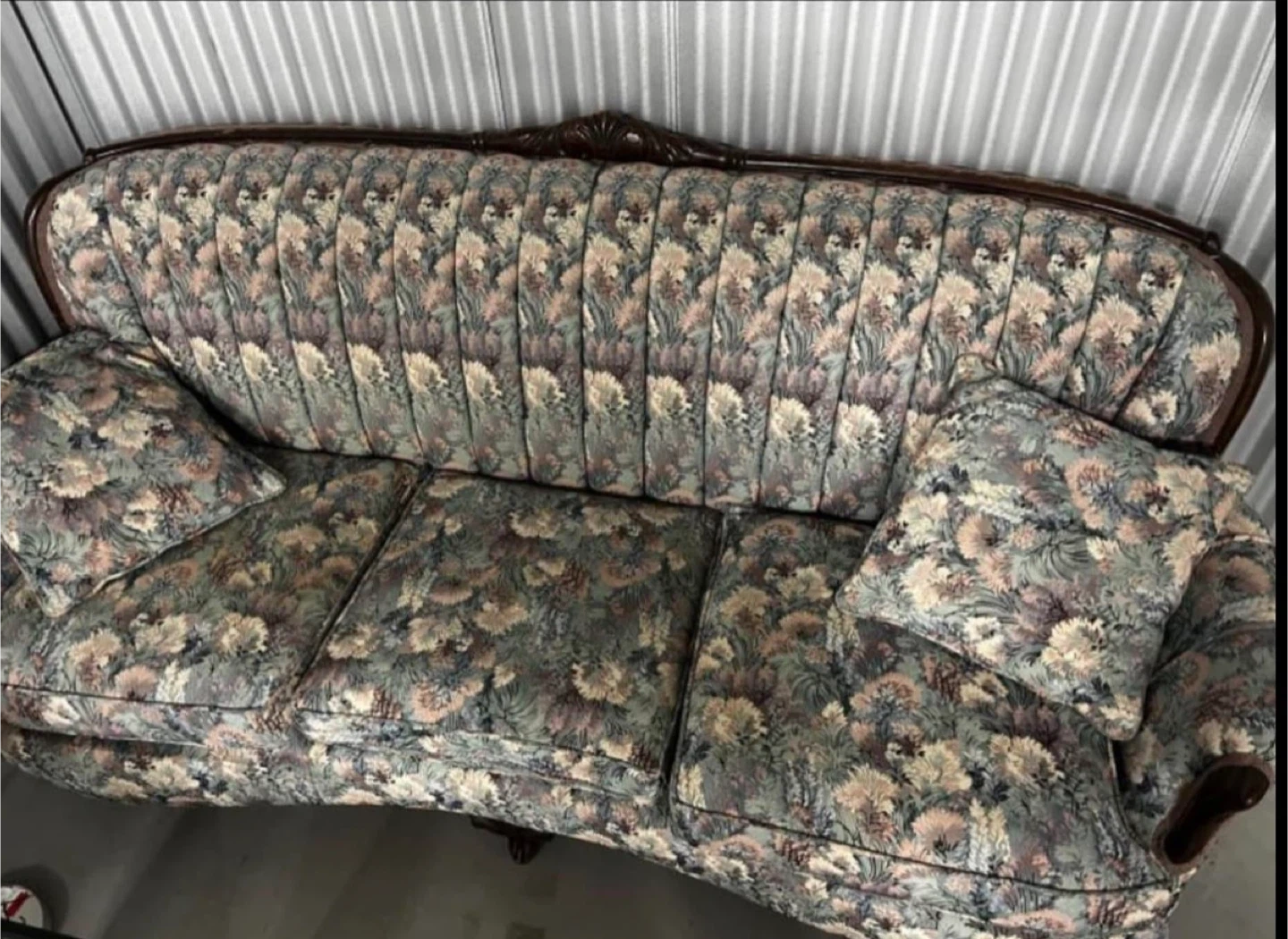Vintage sofa with a floral upholstery pattern. It features decorative wood trim along the top and arms. Includes matching throw pillows.