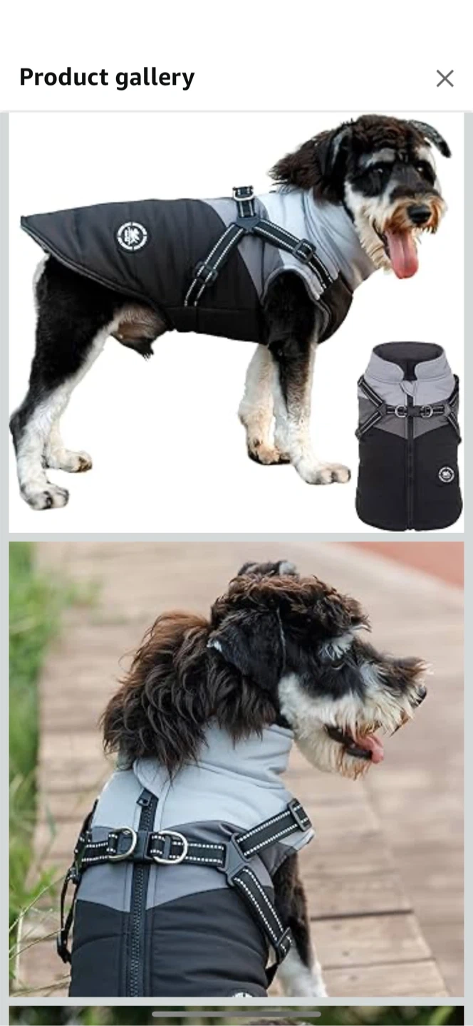 Keep your furry friend warm this winter with this Norbi dog winter coat! It's in great condition and features a stylish black, grey, and white design. Perfect for small dogs, this jacket includes a harness for easy walks. Check out the size chart in the photos to ensure the perfect fit for your pup