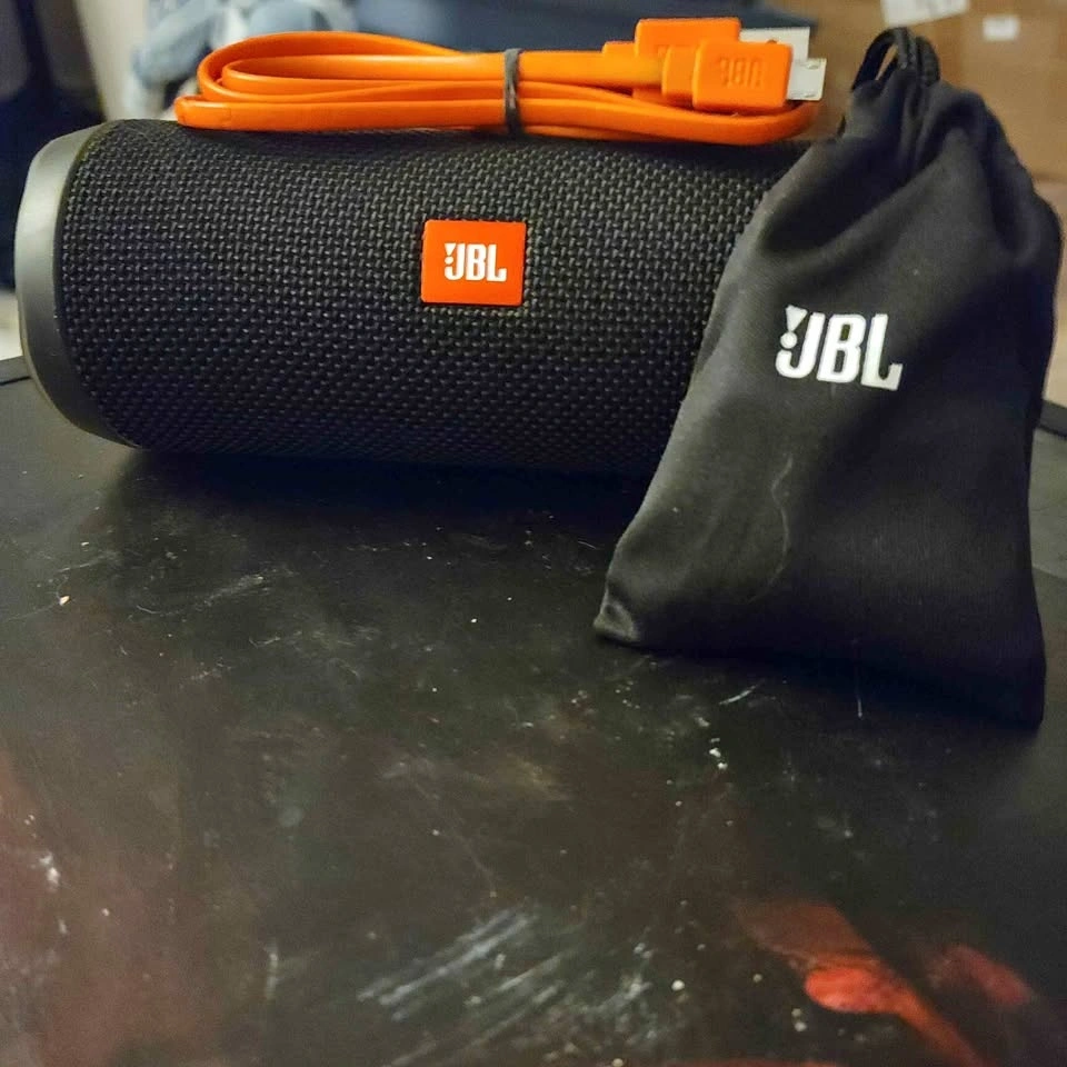 JBL flip 4 Bluetooth speaker and a pair of JBL wired earbuds.