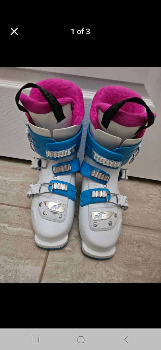 15Selling a pair of Nordica ski boots in white and blue. They have a pink inner lining. They show some signs of wear but are still in good condition for hitting the slopes!