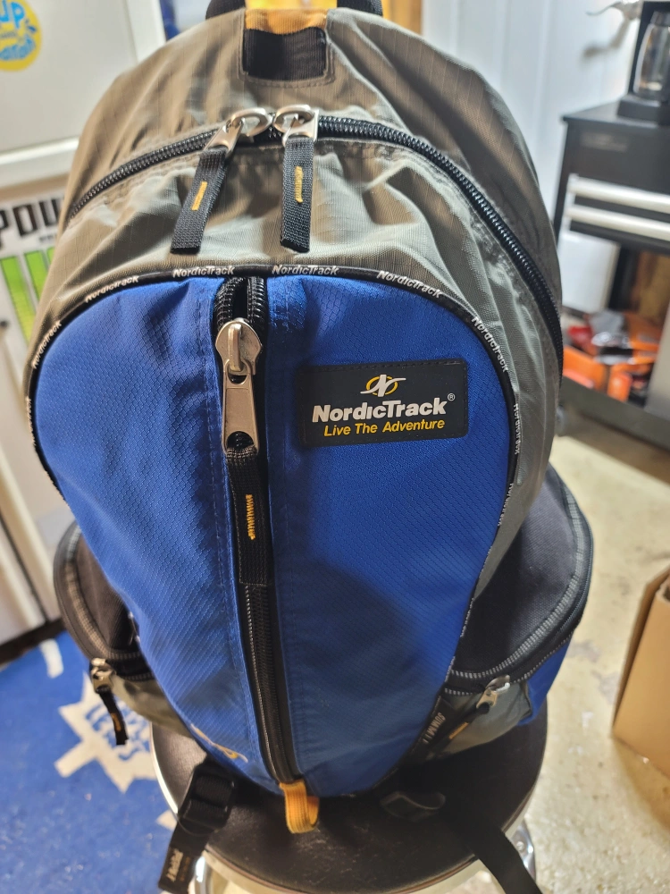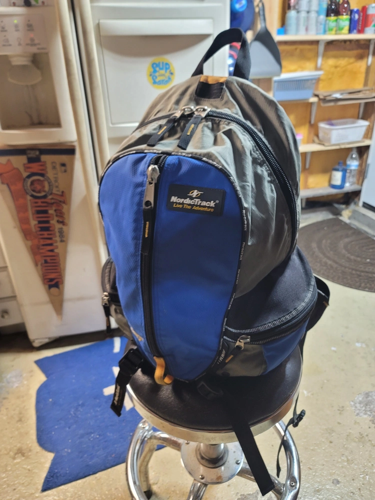 NordicTrack "Summit" backpack! No rips or tars all zippers work It's a mix of blue, grey, and black. Great for carrying your essentials on hikes or just around town