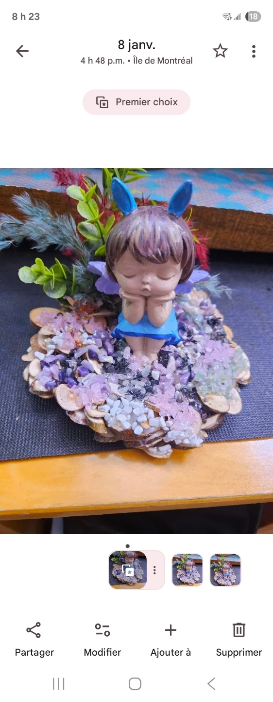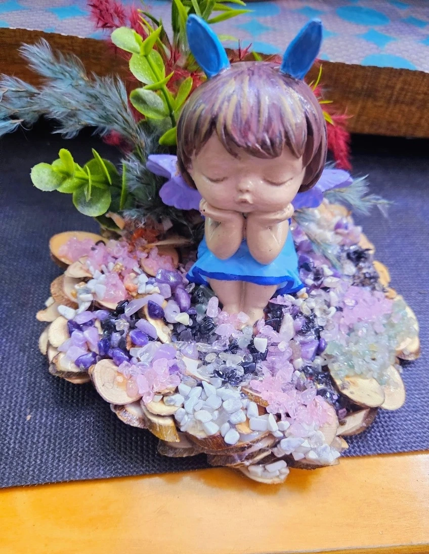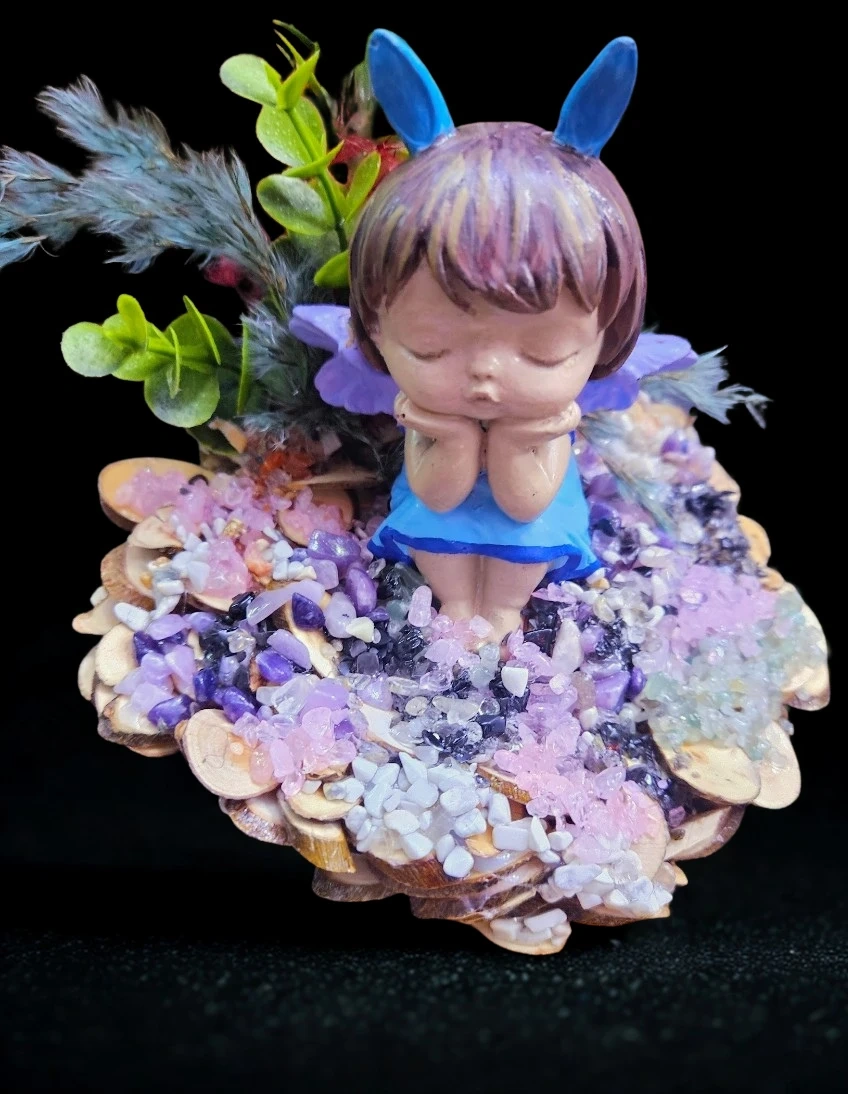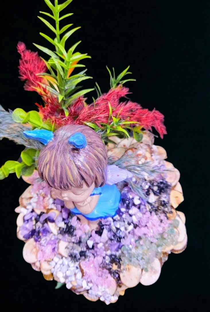 Charmante figurine de fée avec des détails délicats, assise sur un lit de pierres et de matériaux naturels. Parfait pour ajouter une touche de fantaisie à votre décor. Un bel objet de décoration pour un bureau ou une étagère.