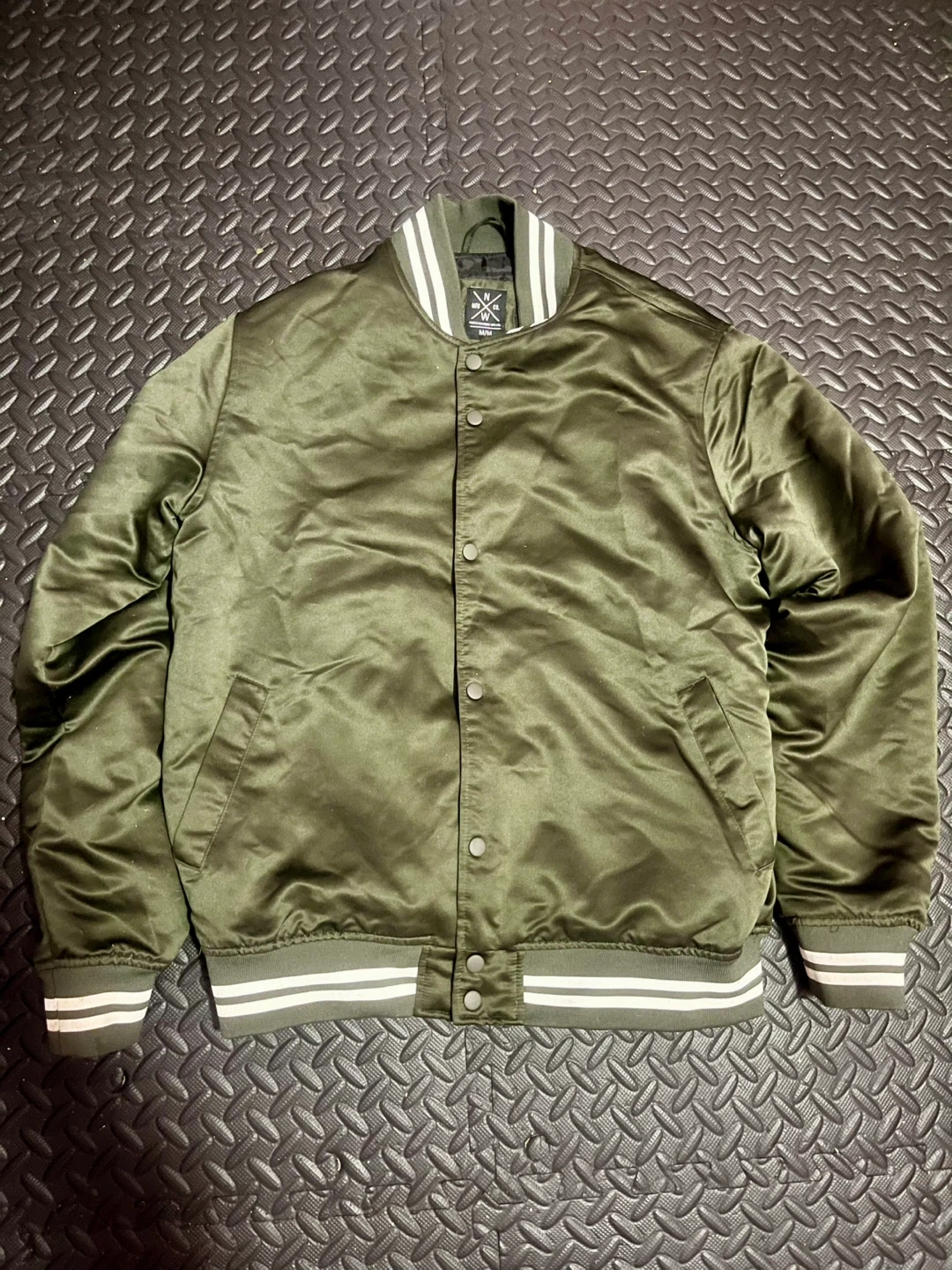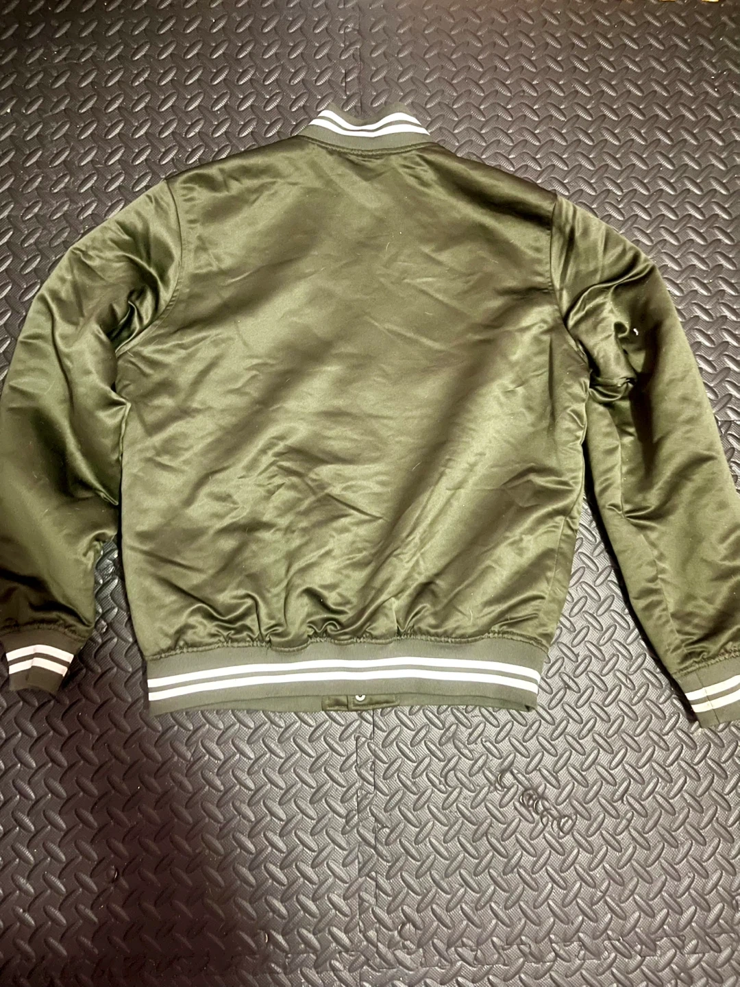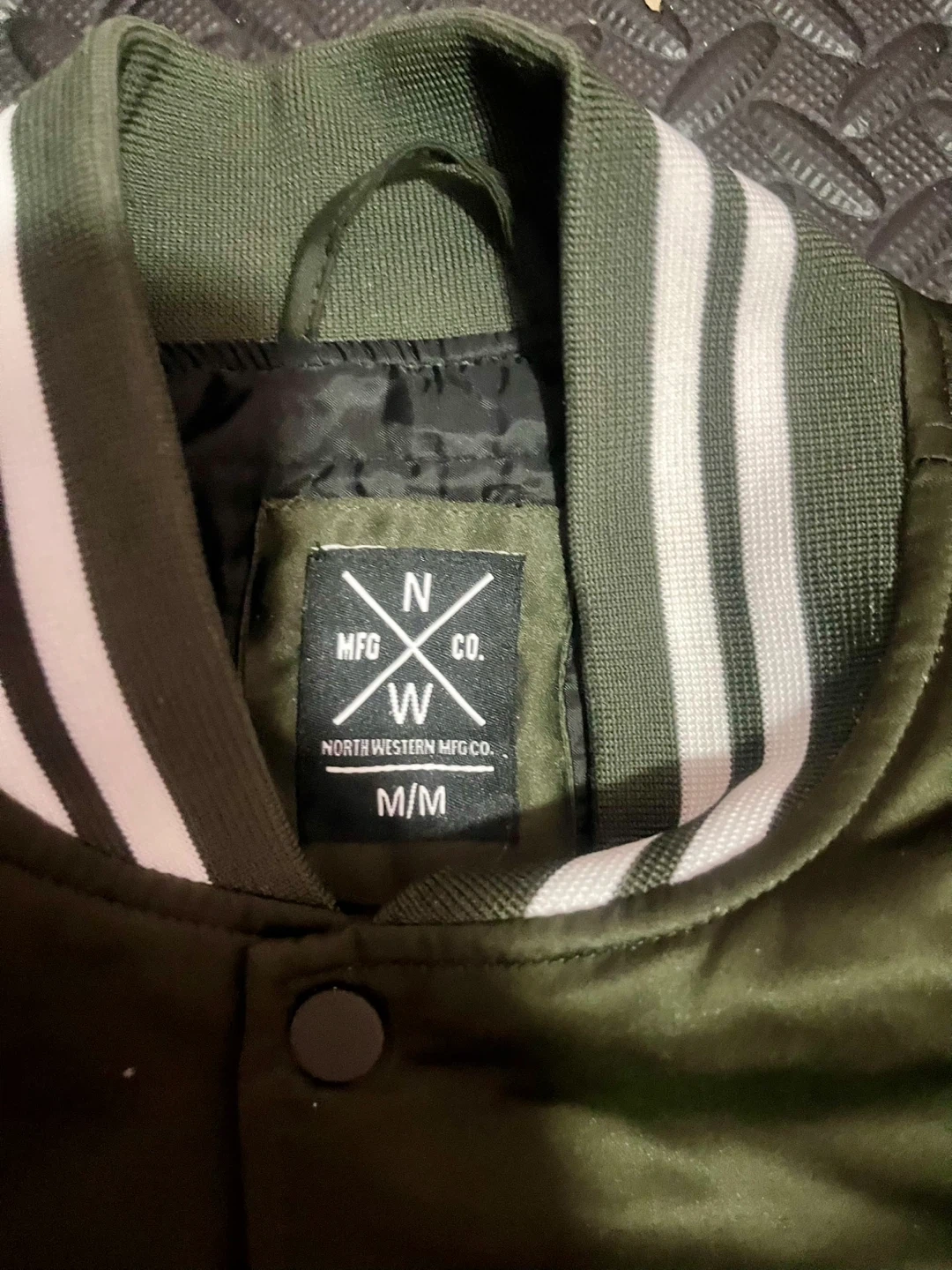 65Snag this stylish North Western MFG bomber jacket, a medium-sized gem in an olive green satin finish! This used jacket features a classic bomber design with striped detailing on the collar, cuffs, and hem, perfect for adding a touch of retro flair to any outfit. It's in great condition, ready to turn heads and keep you cozy. * Size: Medium * Colour: Olive Green * Material: Satin * Style: Bomber Jacket This jacket is looking for a new home, and if this ad is still up, it's still available, so don't miss out on the chance to make it yours! Based on similar bomber jackets, a fair price would be around $30-$50. I'm pricing it at $30. Delivery available for a small fee.