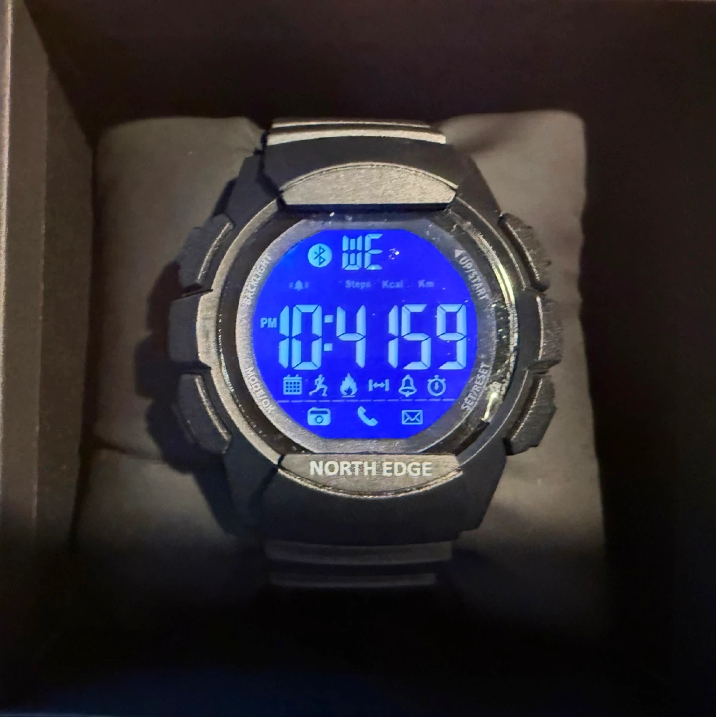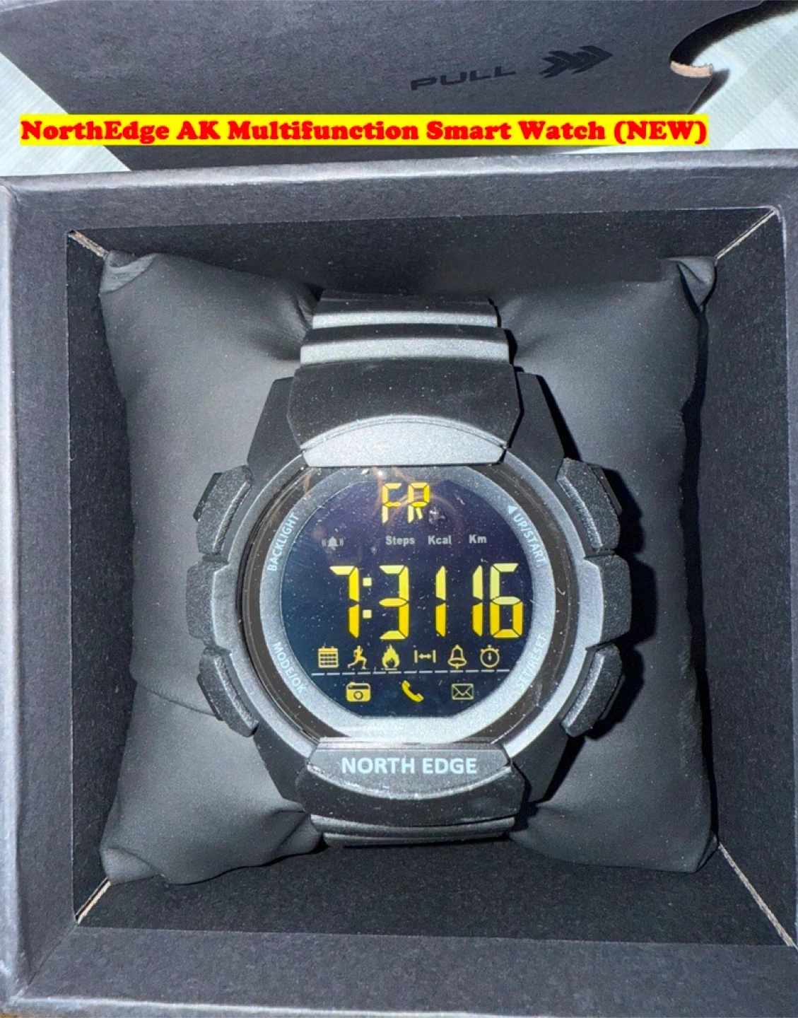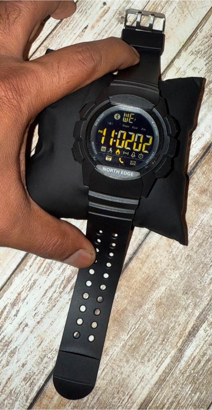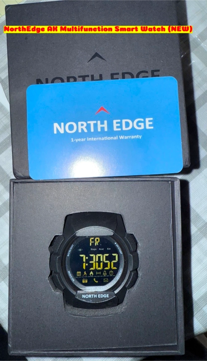 114NorthEdge AK Multifunction Smart Watch (NEW) Bluetooth 4.0; Pairs with Sports+ apps with IOS & Android Capability Scratch Resistance Hardened 3mm Tempered Glass; FSTN / Full View Angle-Sunlight Visible Gravity Sensor; Pedometer; LED Backlight; All-Day activity record; Calorie Burn Tracking; Distance Tracking; Notifications from Incoming Call+Messages+Reminders+Facebook+Whatsapp+Twitter+Skype etc; Remote Camera operations; Day+Date; Alarm; 12/24Hours; Stopwatch etc. Dail-50mm; Thickness-41.8mm; Band Length-25cm; Band Width-26cm; 10Bar / 100m Water Resistance Battery-CR2432 with 33 months Standby Time (NO need to Charge Daily) Asking Price $ 45- (Pickup from near Kingston Road & Markham Road…With Cash Only...I DON’T SHIP/Deliver)