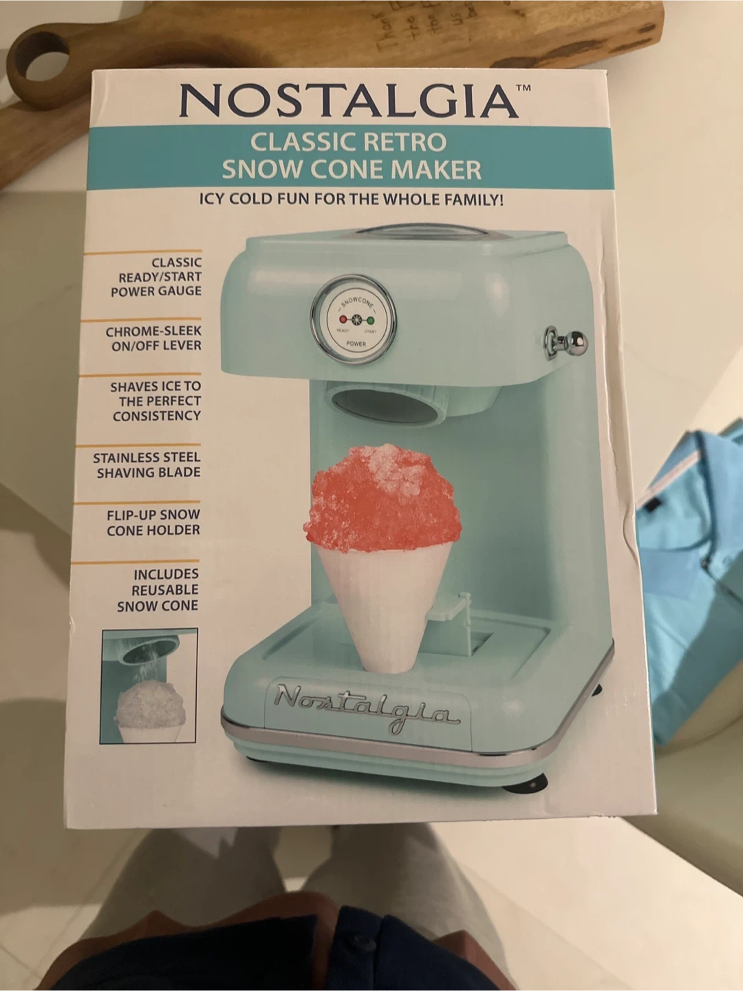 9Get ready for some icy cold fun with this Nostalgia Classic Retro Snow Cone Maker! It features a classic ready/start power gauge, a chrome-sleek on/off lever, and a stainless steel shaving blade. It shaves ice to the perfect consistency and includes a reusable snow cone. Perfect for the whole family!
