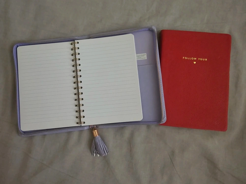 536Two notebooks for sale! One is red. The other is a purple notebook with a zipper case and a tassel. Amazon card is for size reference