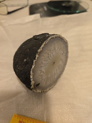 This is a unique and eye-catching display specimen that showcases the beauty of natural agate formations. It's a half eye slice of a geode, revealing stunning details and patterns within the rock. Its black exterior adds a touch of elegance and contrast to the intricate interior structures, making it a great addition for collectors or those interested in rocks, fossils, and minerals.