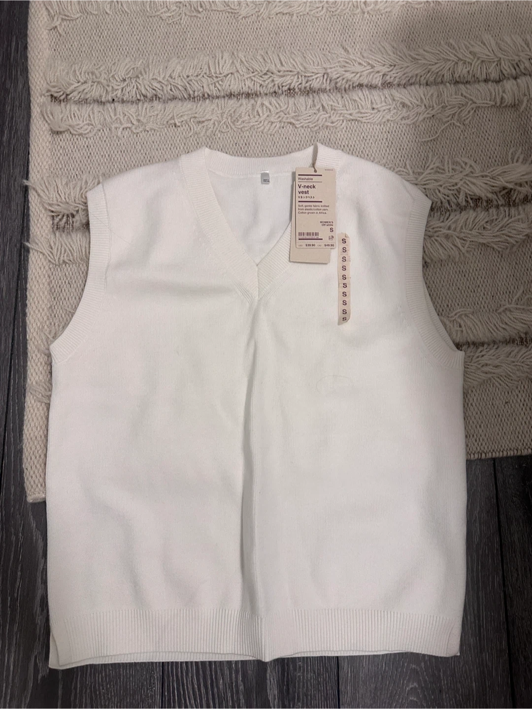 NEW Muji V-neck vest in off-white. Soft, gentle fabric knitted from elastic/cotton yarn. Front ‘S’ sticker is peeling off, but it has never been worn. Purchased for $50 before tax. New with tags. No stains/tears/holes, pet-free and smoke-free household. Pickup at 403 Church St, cash ONLY.