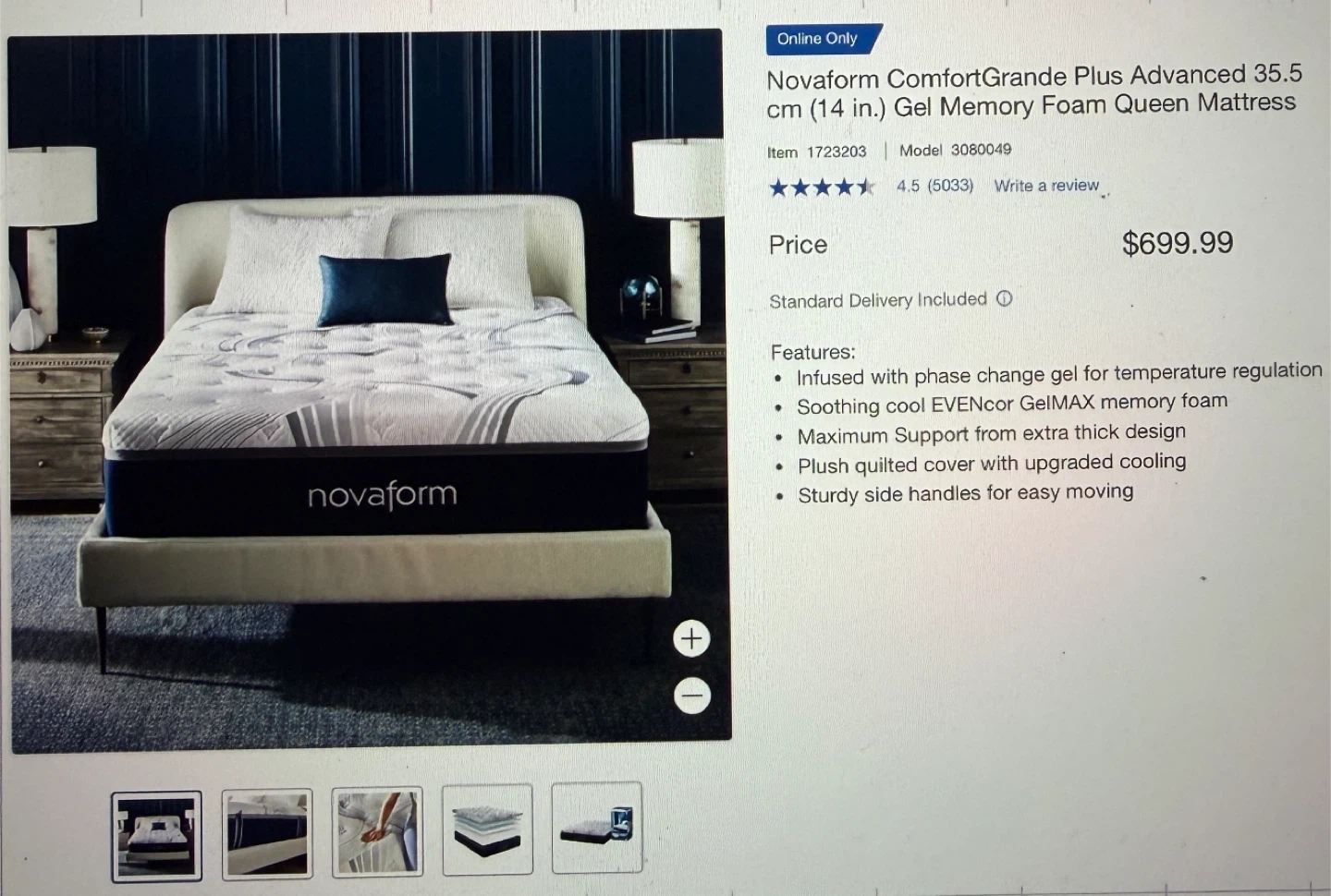 60Selling a Novaform ComfortGrande Plus Advanced 35.5 cm (14 in.) Gel Memory Foam Queen Mattress. It features: - Infused with phase change gel for temperature regulation - Soothing cool EVENcor GelMAX memory foam - Maximum Support from extra thick design - Plush quilted cover with upgraded cooling - Sturdy side handles for easy moving Originally bought for $699.99