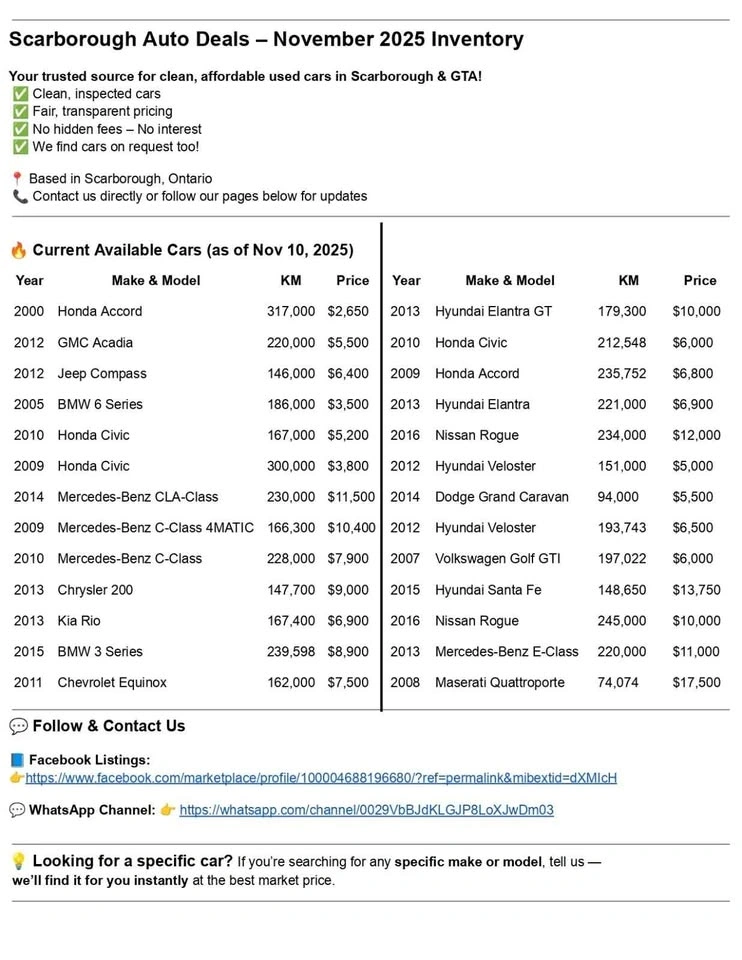 74Scarborough Auto Deals – November 2025 Inventory Your trusted source for clean, affordable used cars in Scarborough & GTA! ✅ Clean, inspected cars ✅ Fair, transparent pricing ✅ No hidden fees – No interest Looking for a specific car? If you’re searching for any specific make or model, tell us — we’ll find it for you instantly at the best market price.
