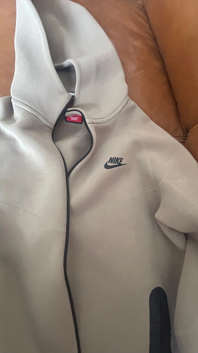 This is a Nike Tech Fleece size large hoodie, perfect for workouts or everyday wear. It's in excellent condition, worn once, and has a comfortable fit. The hoodie features a full zip, a paneled hood, and two side pockets. Brand: Nike. Style: Tech Fleece Hoodie. Size: Please see photos for size tag. Closure: Zip. Cash accepted. Cashless payment accepted.