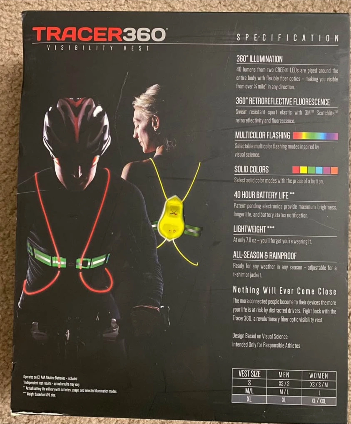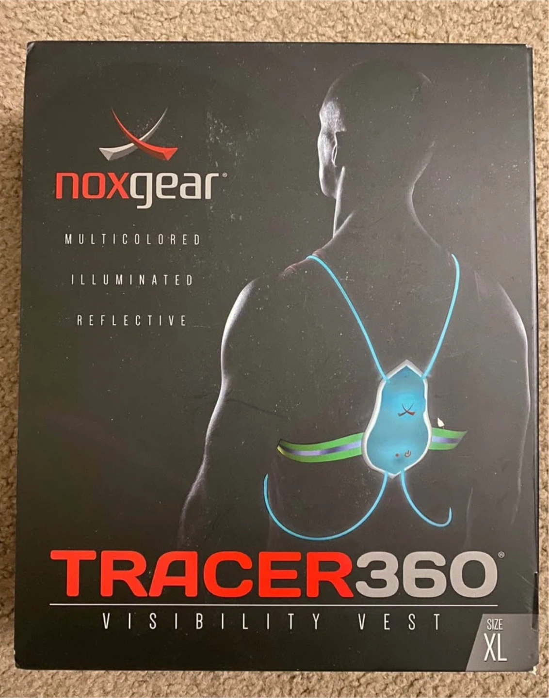 Get noticed during your runs or walks with this Noxgear Tracer360 visibility vest! It's a multicoloured, illuminated, and reflective vest in size XL. The vest features 360° illumination with 40 lumens from two CREE® LEDs piped around the entire body with flexible fiber optics, making you visible from over ¼ mile in any direction. It's lightweight at only 7.0 oz, so you'll forget you're wearing it. Plus, it's all-season and rainproof, ready for any weather in any season - adjustable for a t-shirt or jacket