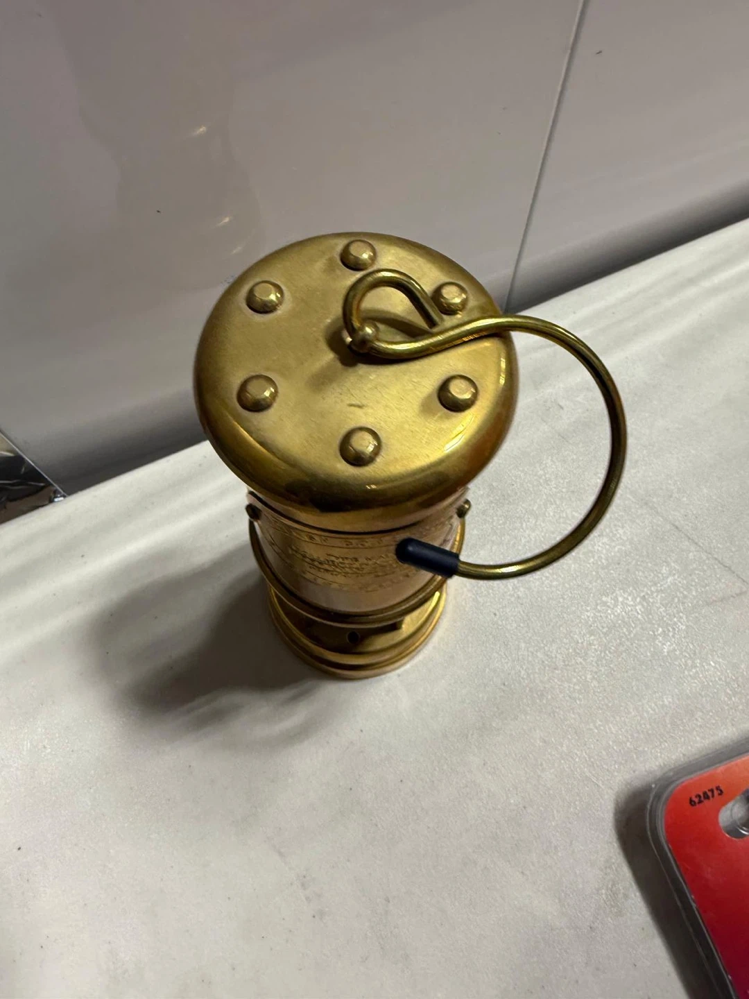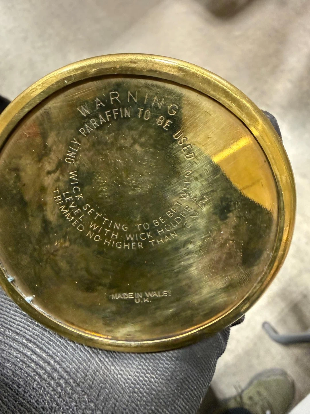 This is a brass Type Vale coal mining lamp from the Aberaman Colliery Company, Wales. It's a vintage piece, made in Wales, U.K. The lamp is designed for paraffin fuel and has specific instructions for wick setting and trimming. It's a collectible item for enthusiasts or as a unique decorative piece.