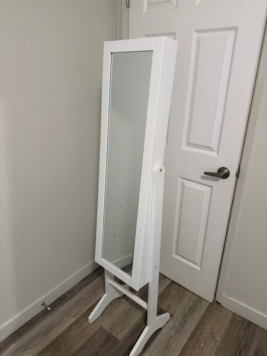 This standing jewelry armoire features a full-length mirror on the front. Inside, it offers ample storage with shelves and compartments for organizing your jewelry. It's made of wood and has a clean white finish.
