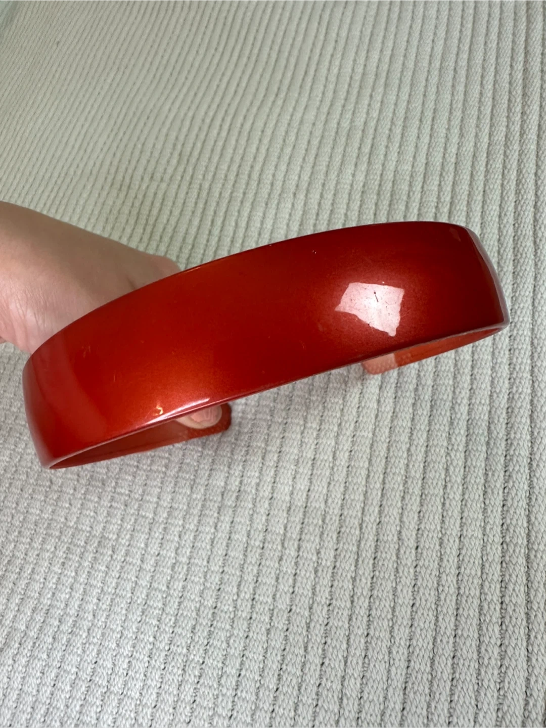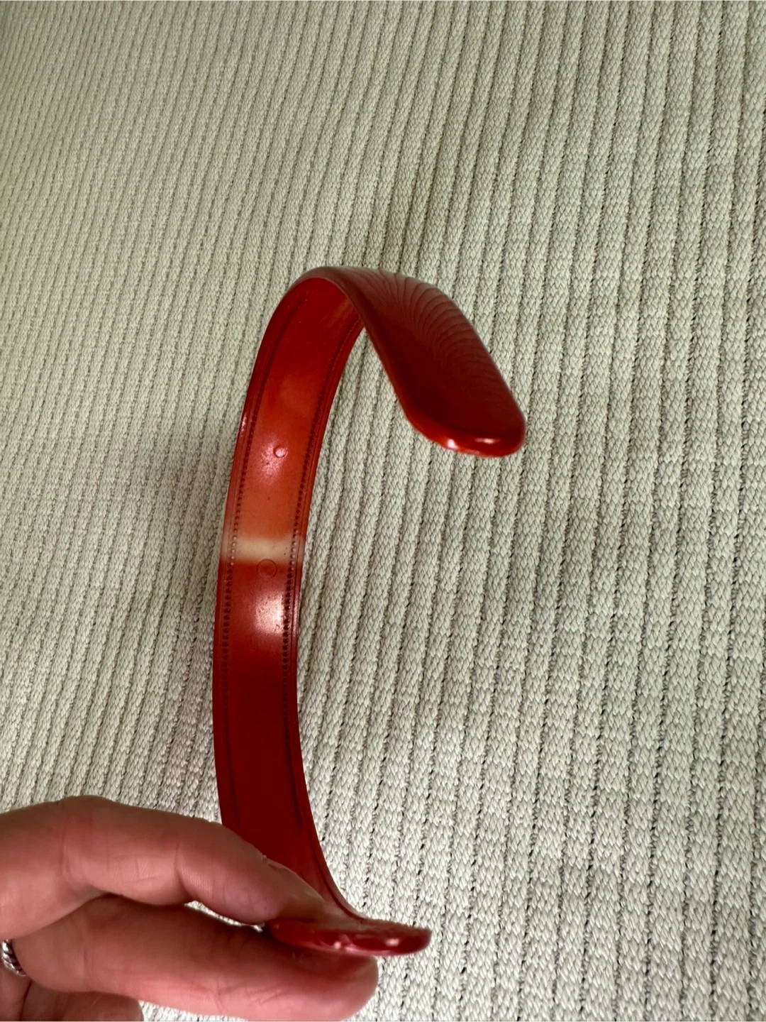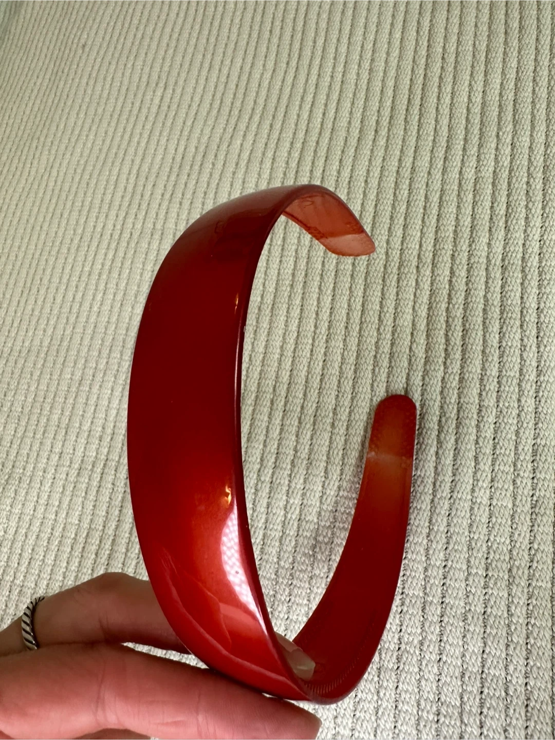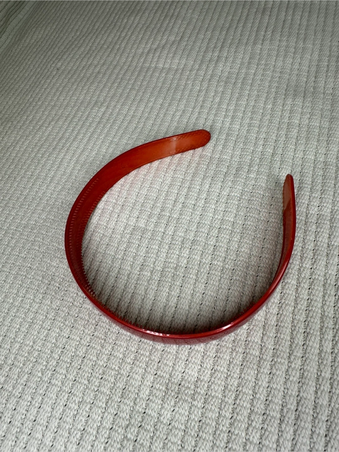 Red solid plastic headband with a glossy finish. The headband is made of a sturdy plastic material and measures approximately 1 inch wide.