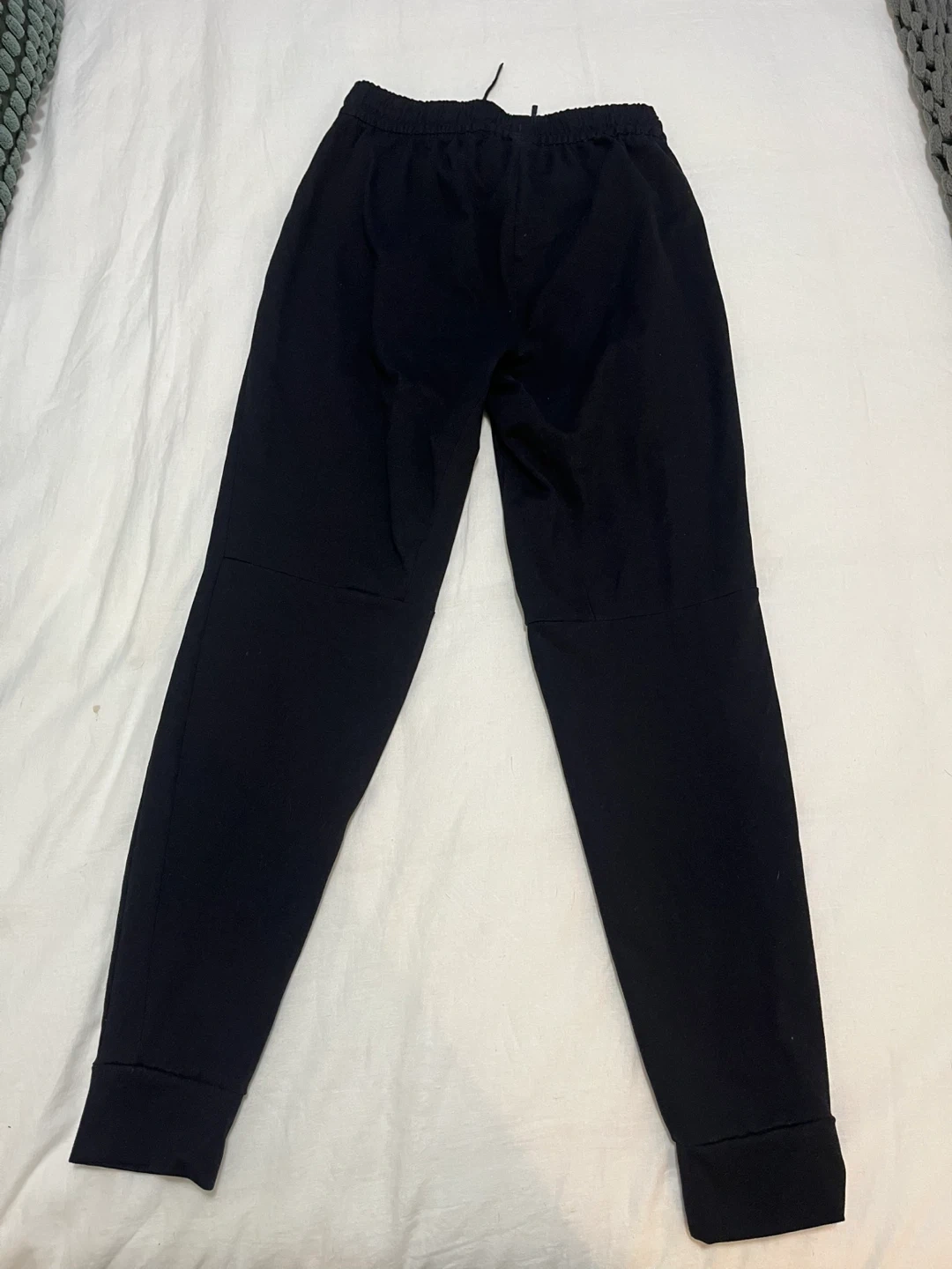 These are black NOBULL jogger pants in size small. They're made of a comfortable fabric with zippered pockets and a drawstring waist. Perfect for workouts or casual wear!