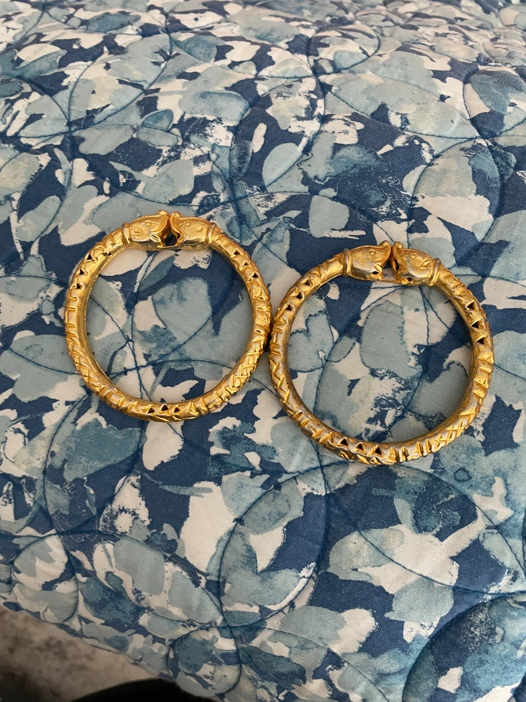 A pair of gold-tone bangle bracelets. Each bracelet features a decorative textured band and a clasp designed as an animal head. These bangles add a unique touch to any outfit.