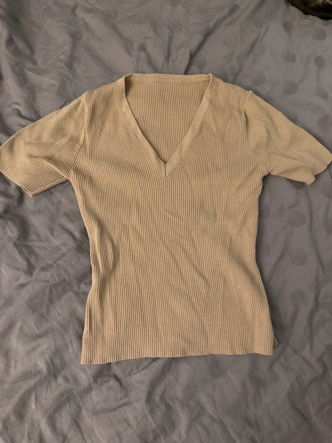 Tan V-neck top with short sleeves. Ribbed knit material. It's a versatile piece for everyday wear.