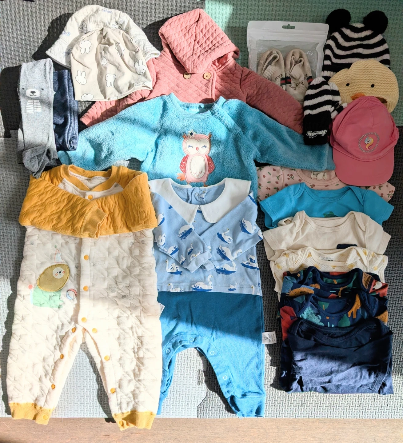 Baby girl clothes bundle consisting of 5x hats, 1x gloves, 1 x sock shoes, 1x T-shirt, 3x short sleeve onesies, 3x long sleeve onesies, 1xtights, 1xleggings, 2x outer jackets/sweatshirts, 2x rompers. For 6-12 months, some are new, some may show signs of wear from washing, but mostly EUC with no stains or rips. $15 for all.