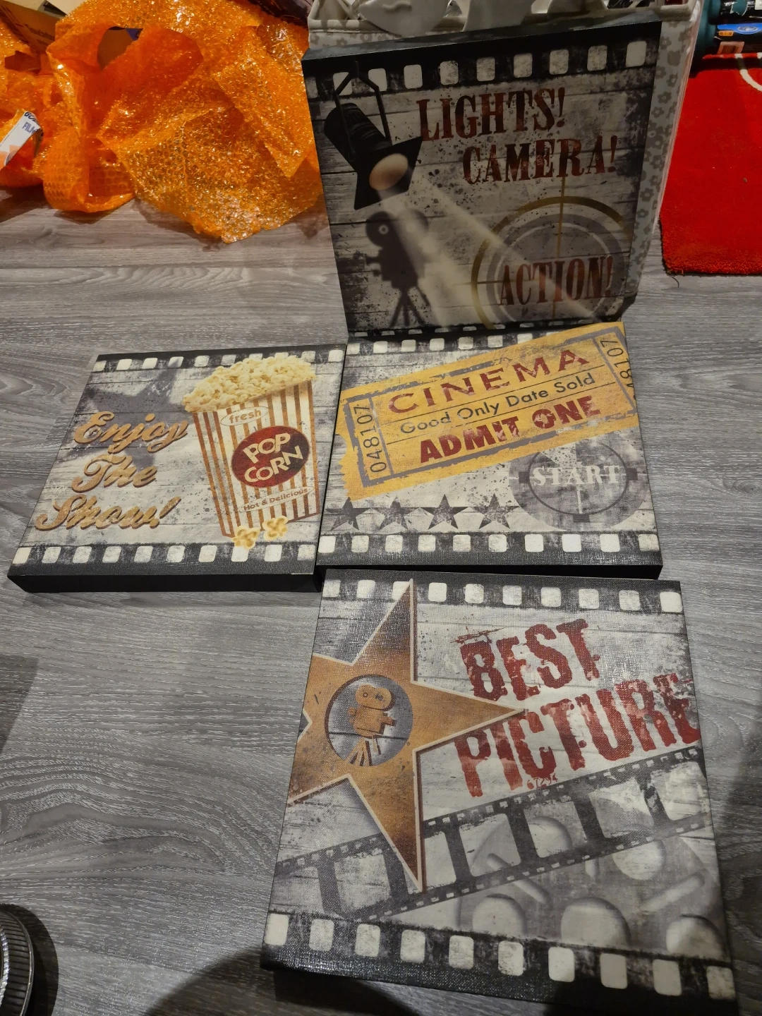 Spruce up your home theatre or entertainment room with this set of four cinema-themed wall art pieces! Each piece features a unique design, including popcorn, a cinema ticket, a spotlight, and a 'Best Picture' graphic. These are perfect for adding a touch of Hollywood charm to any space