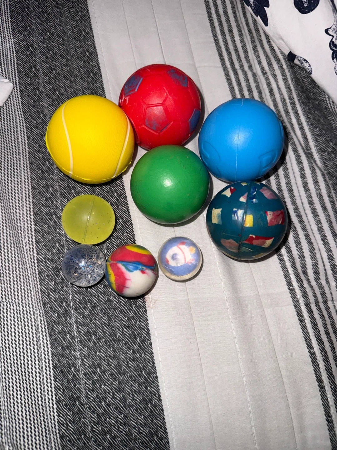 Collection of assorted bouncy balls and toy balls. Includes a yellow squishy ball, a red spinning soccer ball, a blue ball, a green ball, a clear yellow ball, a blue swirl marble, a colourful marble, and a blue marble with a design. They're great for playtime!
