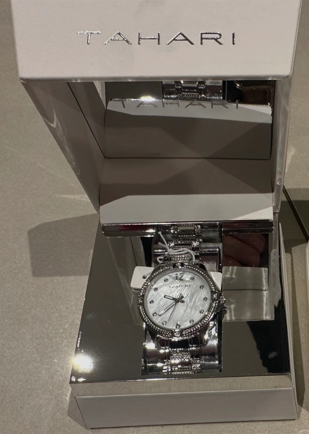 This is a Tahari women's watch featuring a silver-tone band and a mother of pearl dial. It comes in its original box. It's a stylish accessory for everyday wear.