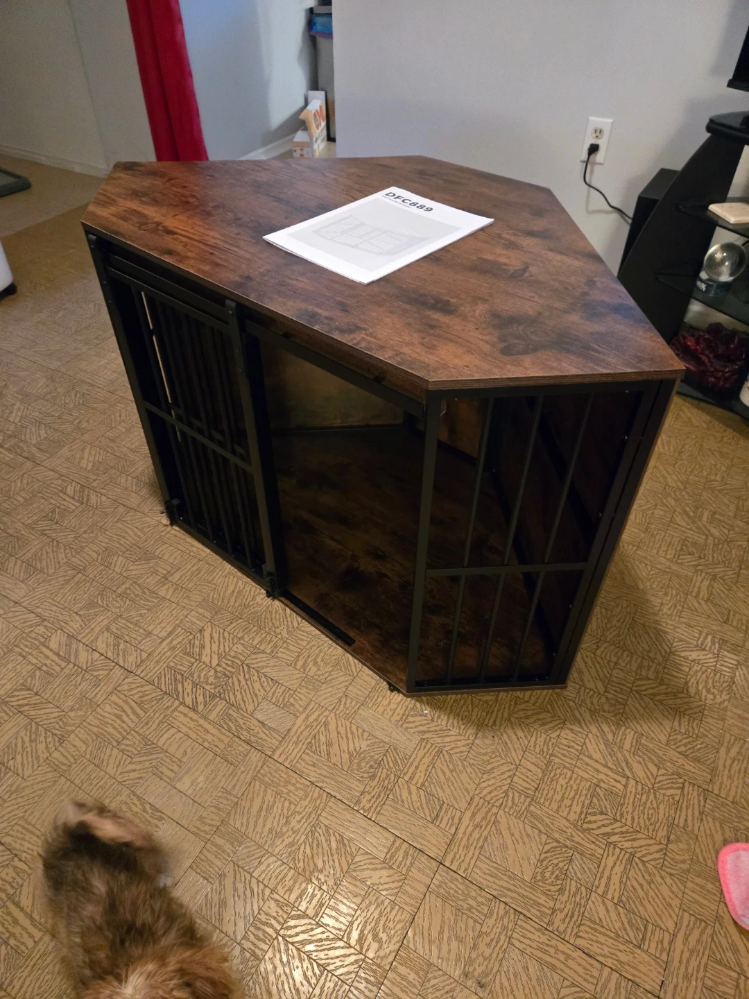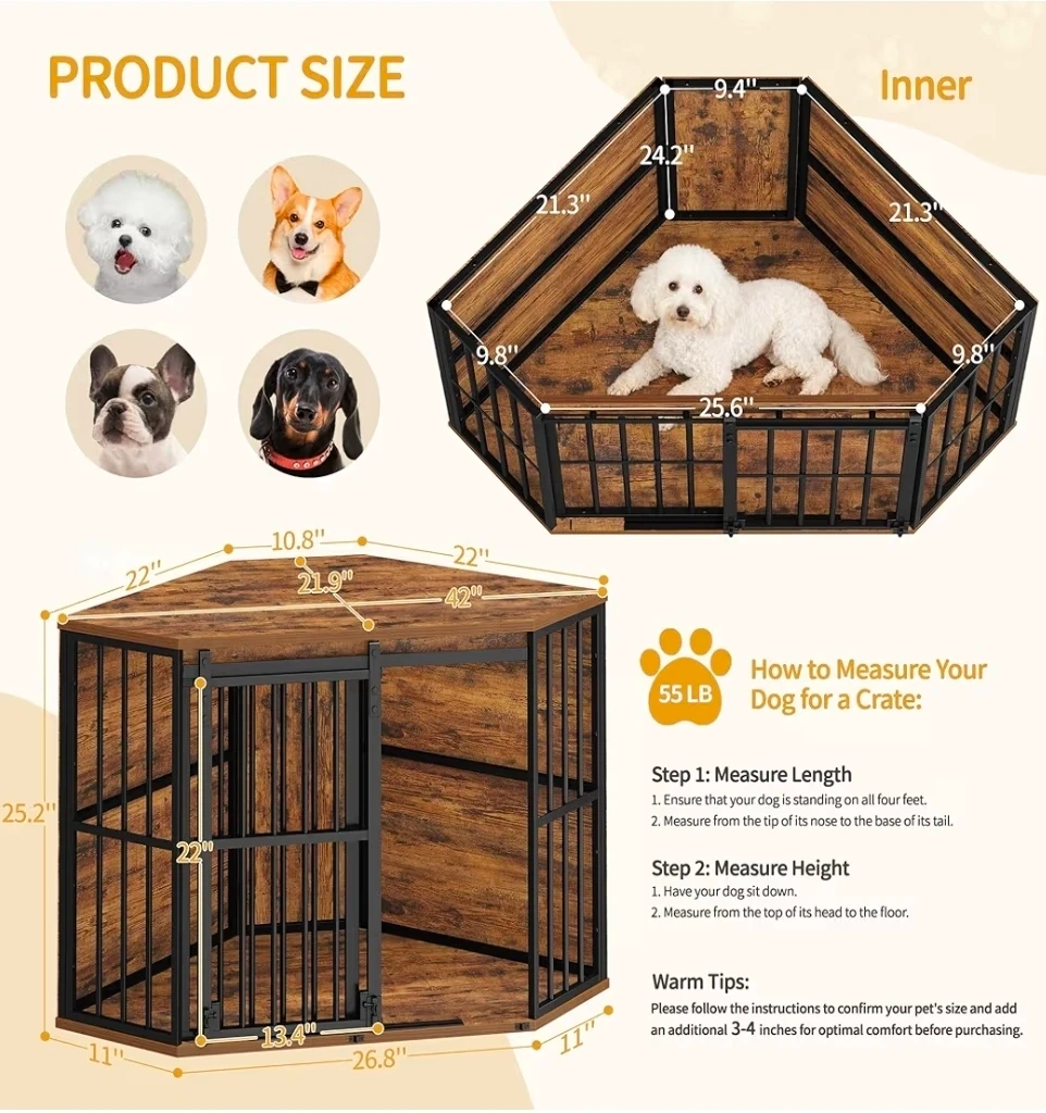 This is a corner dog crate furniture with a barn door design. It's made of particleboard and metal. The dimensions are 42" W x 26.8" D x 25.2" H. It's suitable for small to medium dogs.